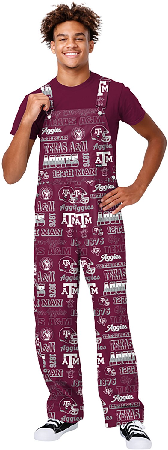 Make a bold statement on game day in these FOCO Men's Texas A&M Aggies Repeat Print Overalls. They are made of 100% canvas material for durability, and the overalls feature a team licensed logo and repeat logos to display your fandom. Designed with a stripe pattern.
