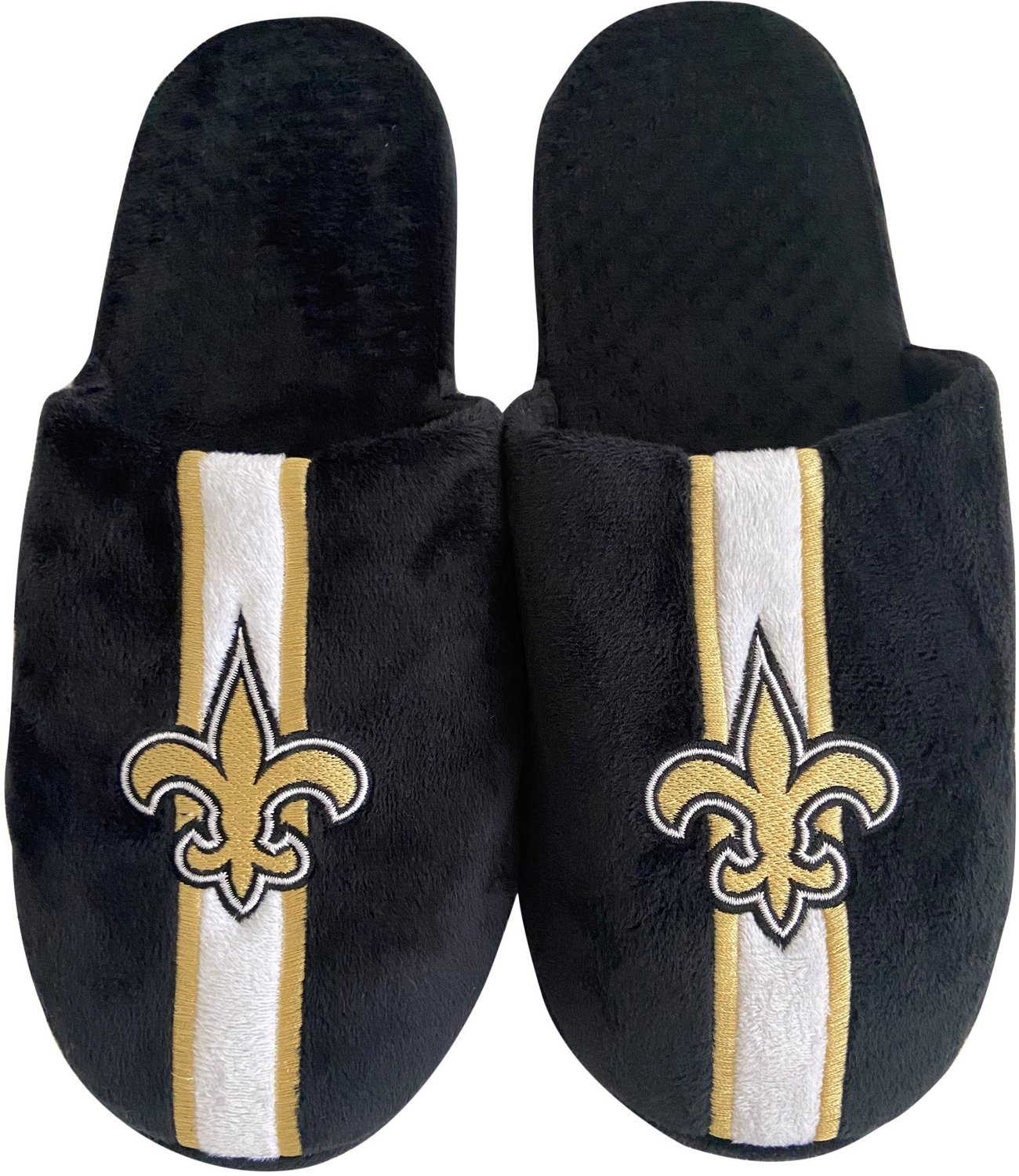 Get cozy while watching the big game with the FOCO New Orleans Saints Team Stripe Slippers. Plush polyester warms your feet and provides lasting comfort, while team-color stripes and an embroidered logo show off your New Orleans Saints pride.