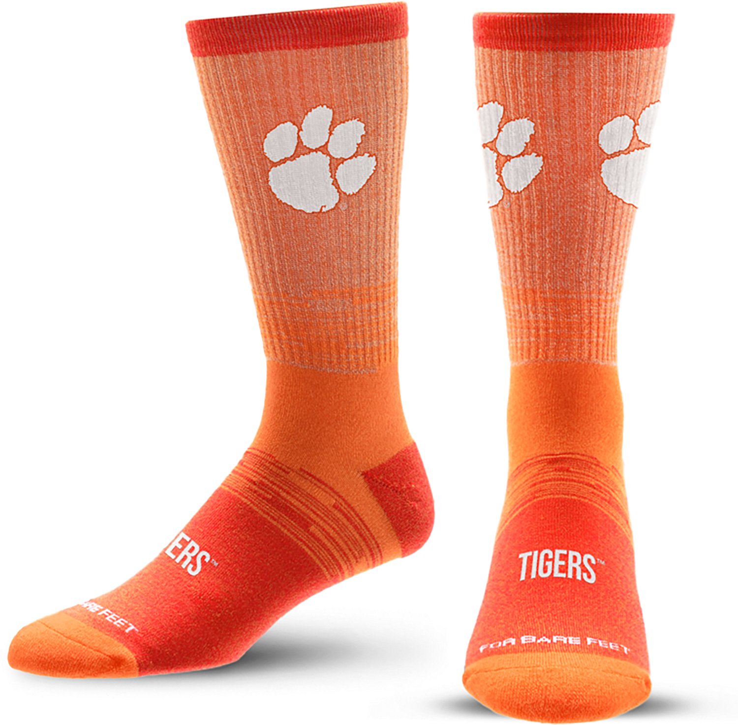 Subtly show off your team spirit with the For Bare Feet Adults' Clemson Tigers Tonal Socks. They are made of 73% acrylic, 17% polyester, 8% nylon, and 2% spandex. The crew length protects your feet in almost every shoe, and their Clemson Tigers logo adds a sporty detail.