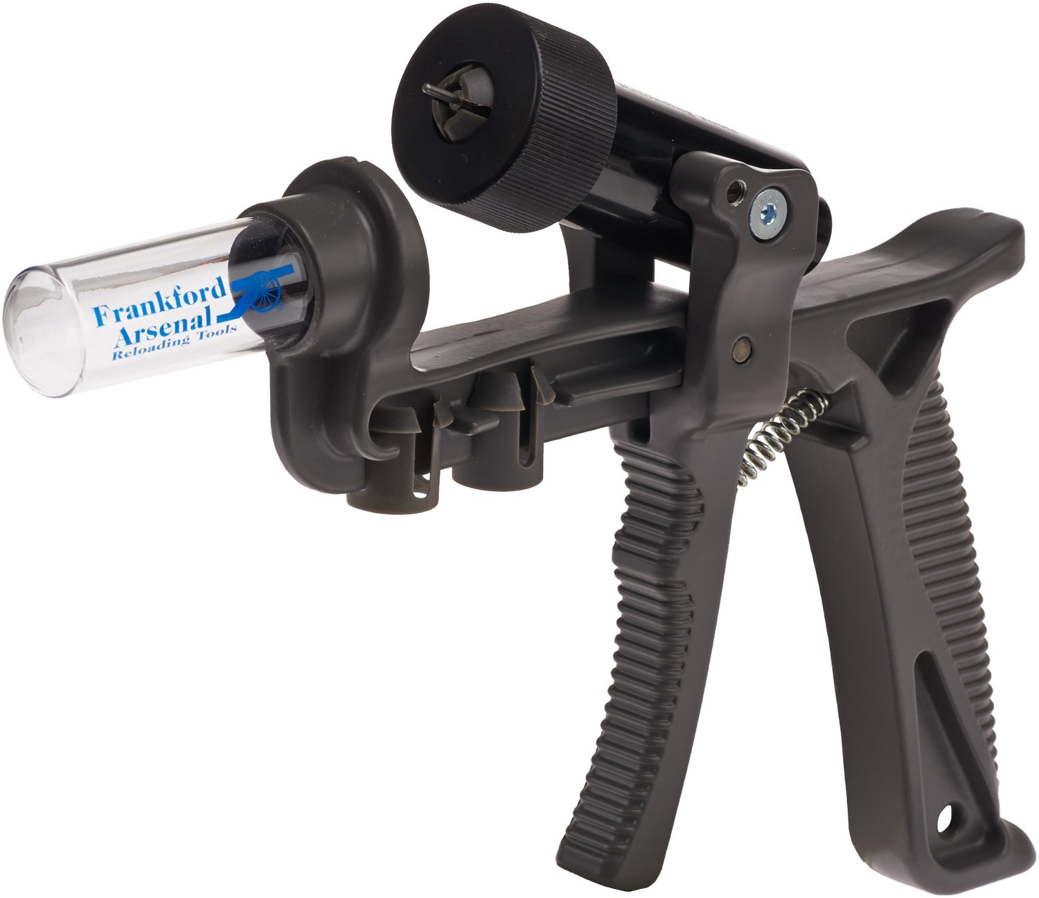 Deprime your spent brass quickly and easily with the Frankford Arsenal Platinum Series Hand Deprimer, which can be used with both rifle and pistol brass and is compatible with calibers from .20 to .338 Lapua. The auto-ejecting case holder lets you easily dispose of deprimed cases, while a catch tube captures the spent primers. Also compatible with military crimped primers. Ergonomic grip.