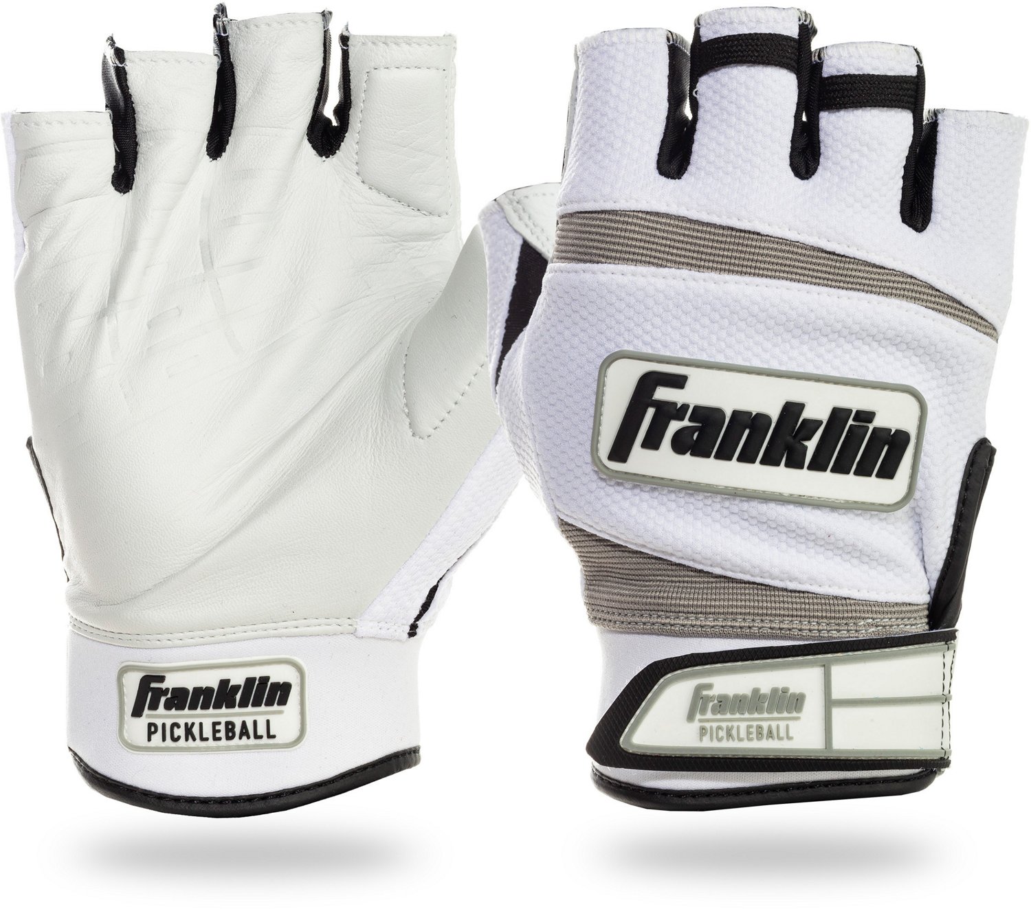 Get a grip on your pickleball game with Franklin Adults' Performance Pickleball Gloves! These premium quality leather pickleball gloves are the perfect on-court pickleball accessories for any avid player. The high-performance, moisture-wicking leather gives players an enhanced grip on their pickleball paddle for complete control of the game. Constructed with additional padding in the thumb and index finger, these pickleball gloves are designed to help players achieve a comfortable grip while preventing blisters and hand soreness. Plus, the high-strength wrist strap guarantees a comfortable, secure fit that won't loosen or detach during play. Available in both right hand and left hand styles, these premium pickleball gloves are great on-court accessories for both righty and lefty pickleball players. Don't let sweaty hands or poor grip get in the way of your pickleball game. With increased grip, players can improve their paddle control and precision shot making skills out on the court. So, if you're ready to take your pickleball game to the next level, grab yourself a Franklin Sports Premium Pickleball glove and take control today!