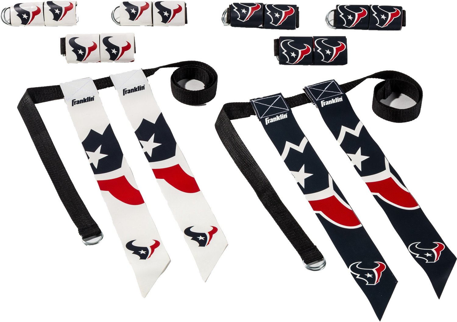 Play football in Texans style with the Franklin Houston Texans 8-Player Flag Football Set. This set includes 8 adjustable one-size-fits-all belts for players of all ages. The tear-away flag sets are great for organized or recreational play and feature Texans team logos and colors to show your team spirit.
