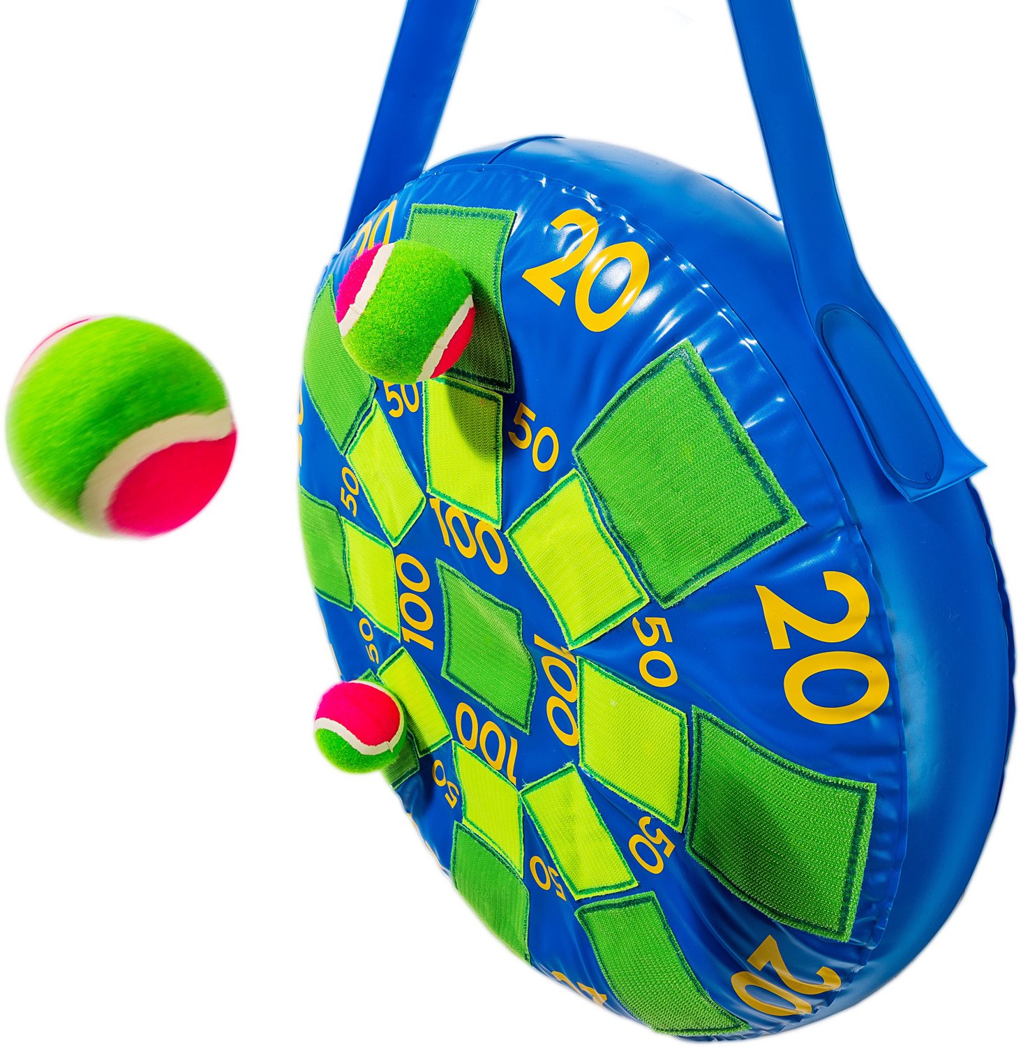 Have some fun with the whole family using the Franklin Kids' 20 in x 20 in Inflatable Dart Board. A safer alternative to a traditional game of darts, this inflatable dartboard features self-stick targets and a set of tennis balls. The strap enables easy hanging.