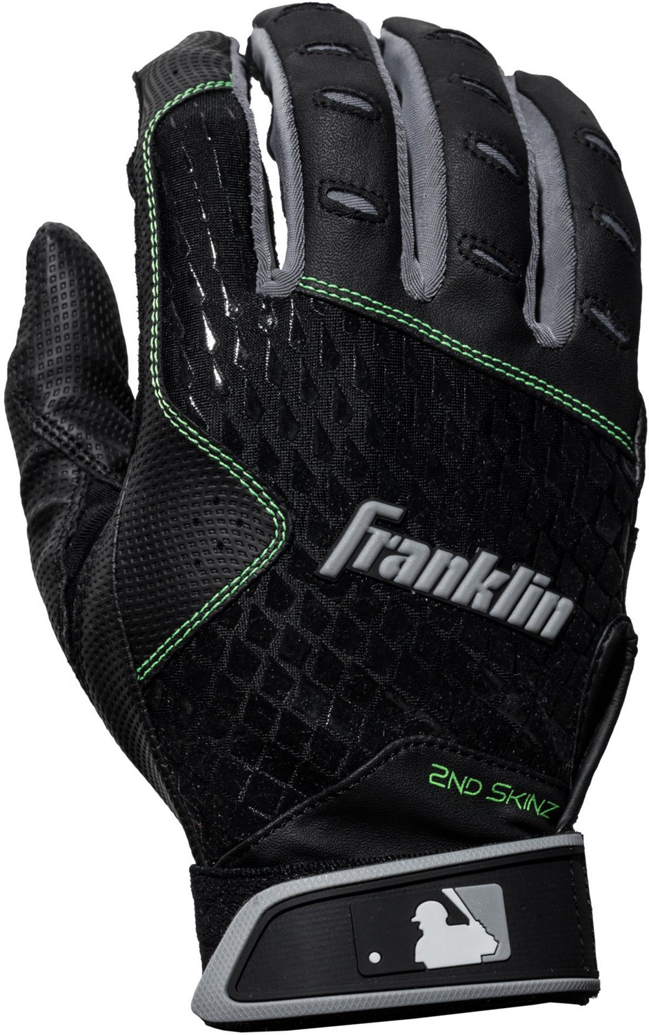 Franklin Sports 2nd Skinz batting gloves are designed for elite-level performance, featuring cutting-edge Digital Technology that maximizes surface area and delivers multi-directional points of contact for an unmatched feel on the bat. Built to last, a genuine leather heel patch reinforces key wear zones, enhancing durability and extending the glove’s lifespan. With Tri-Curve® Technology, each glove mirrors the natural shape of the human hand to reduce bunching and ensure a perfect fit. Quad-Flex Technology® anticipates palm flex for a snug, secure grip around the bat handle, while the seamless, one-piece palm construction provides a smooth, responsive feel that resists bunching and tearing for lasting comfort and performance.