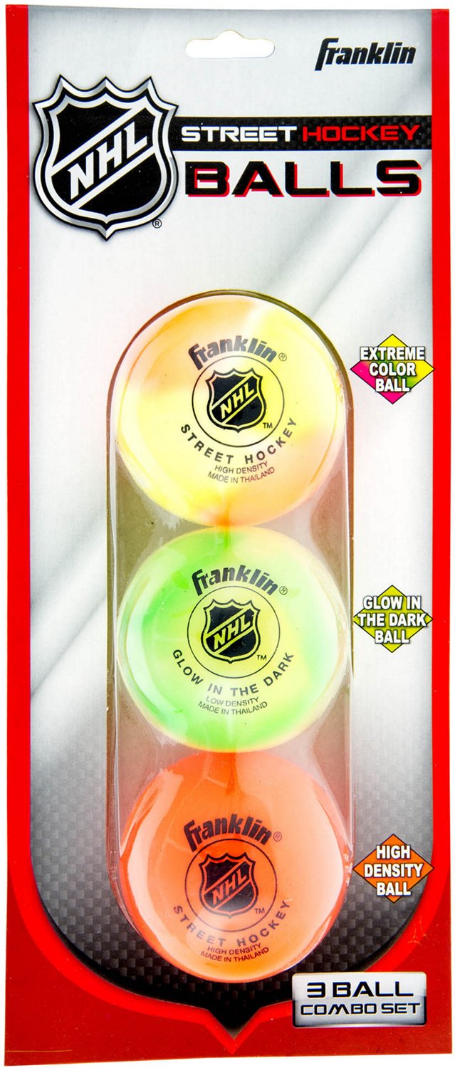 Make each game one to remember with the Franklin NHL 3-Piece Hockey Ball Set. An extreme color high-density ball allows you to keep track of the competition with ease, while the included glow-in-the-dark ball makes low-light action a breeze. Each ball is officially sized to accommodate versatile use.