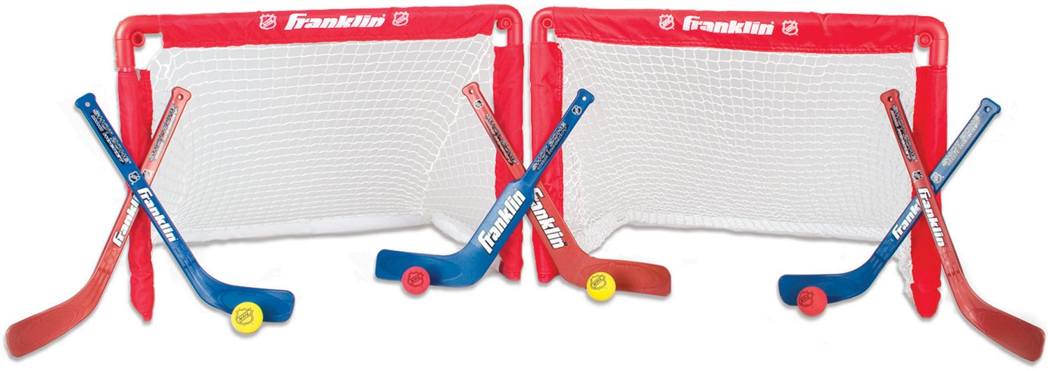 Practicing hockey is more fun when you do it with friends. Great for neighborhood pick-up games and family get-togethers, the Franklin NHL Mini Folding 2-Goal Combo Set can accommodate multiple players. With 2 high-impact goals, 6 hockey sticks and 4 soft-foam balls, every game will be fun and exciting. Afterwards, simply collapse the Insta-Set® goals and stow them away inside the included carry bag.