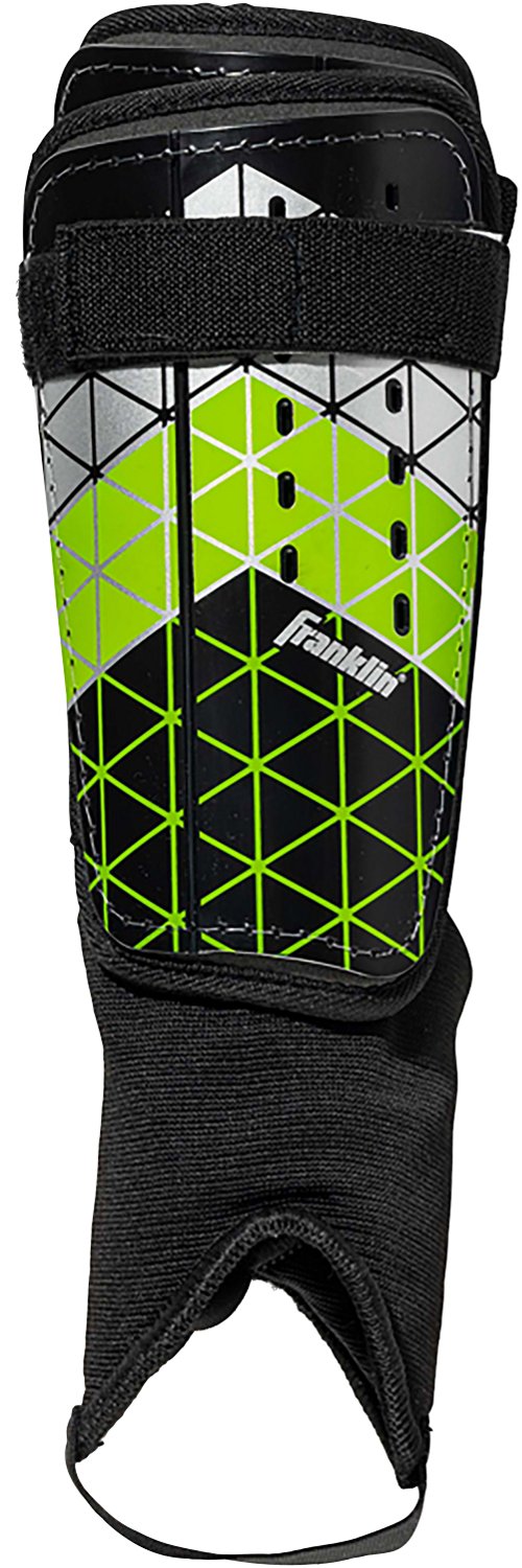 Protect your legs with the Franklin Sports Kids' Field Master Shin Guards. Their high density abrasion resistant shell with a flex hinge matches the contours of the shin. The anatomically embossed foam provides excellent energy absorption for a comfortable feel and superior fit, and their removable ankle pad and self-stick strap adjusts to ensure a security. The upper elasticated strap wraps around the shin guard to keep it in place.