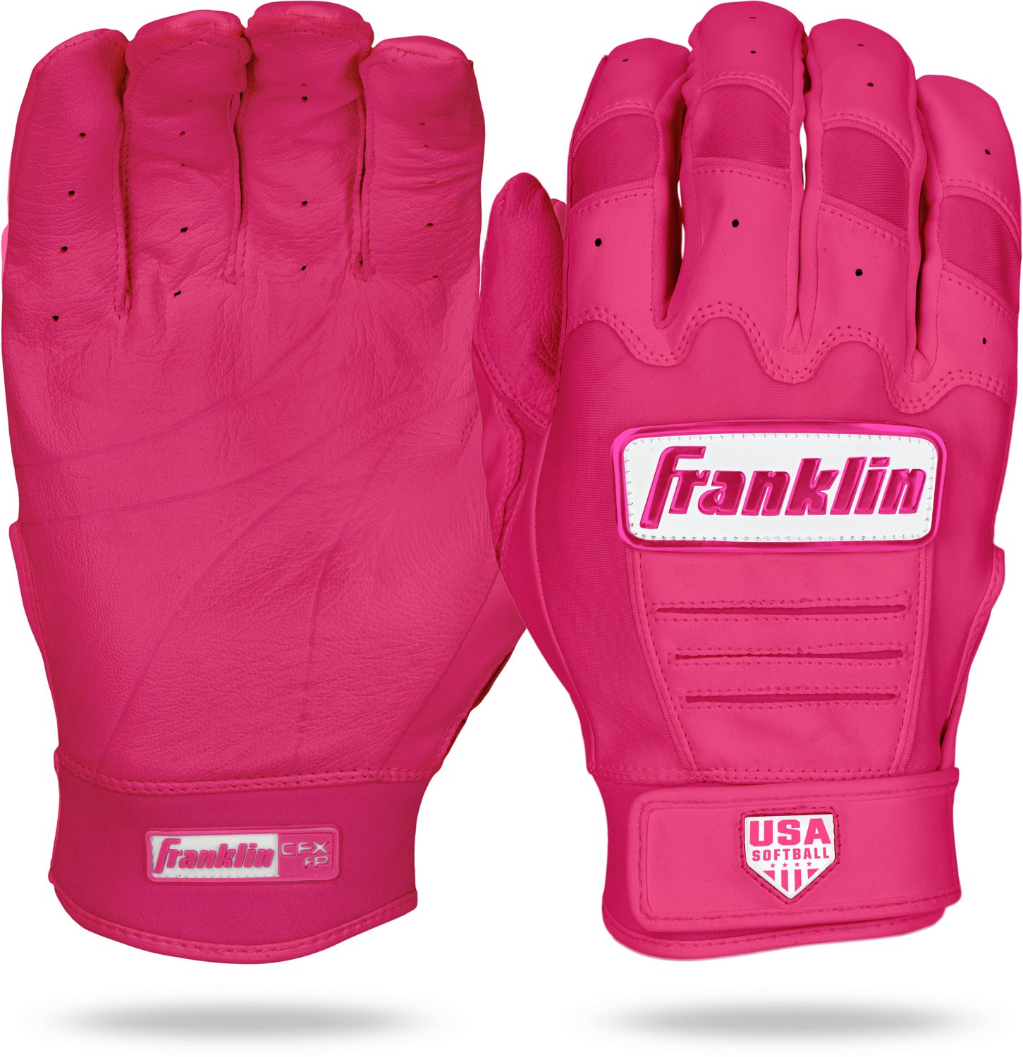 Franklin Sports is bringing its time-honored classic batting gloves to the world of fastpitch and slowpitch softball and changing the game for good with the all-new CFX FP - USA batting gloves. These are the first batting gloves from Franklin Sports to be specifically designed and built to fit the contours of the female hand so women and girls can enjoy increased comfort and performance at the plate. Constructed with the same premium quality leather as our CFX Pro model, the CFX FP is designed to bring the same level of performance exhibited by our MLB pros to softball diamonds across the country. As the official batting glove of USA Softball, the CFX FP is made to play at the highest level with unmatched durability to last season after season. Bring your softball game to the next level today with the glove built for you. Change the game and grab your pair of CFX FP batting gloves today!