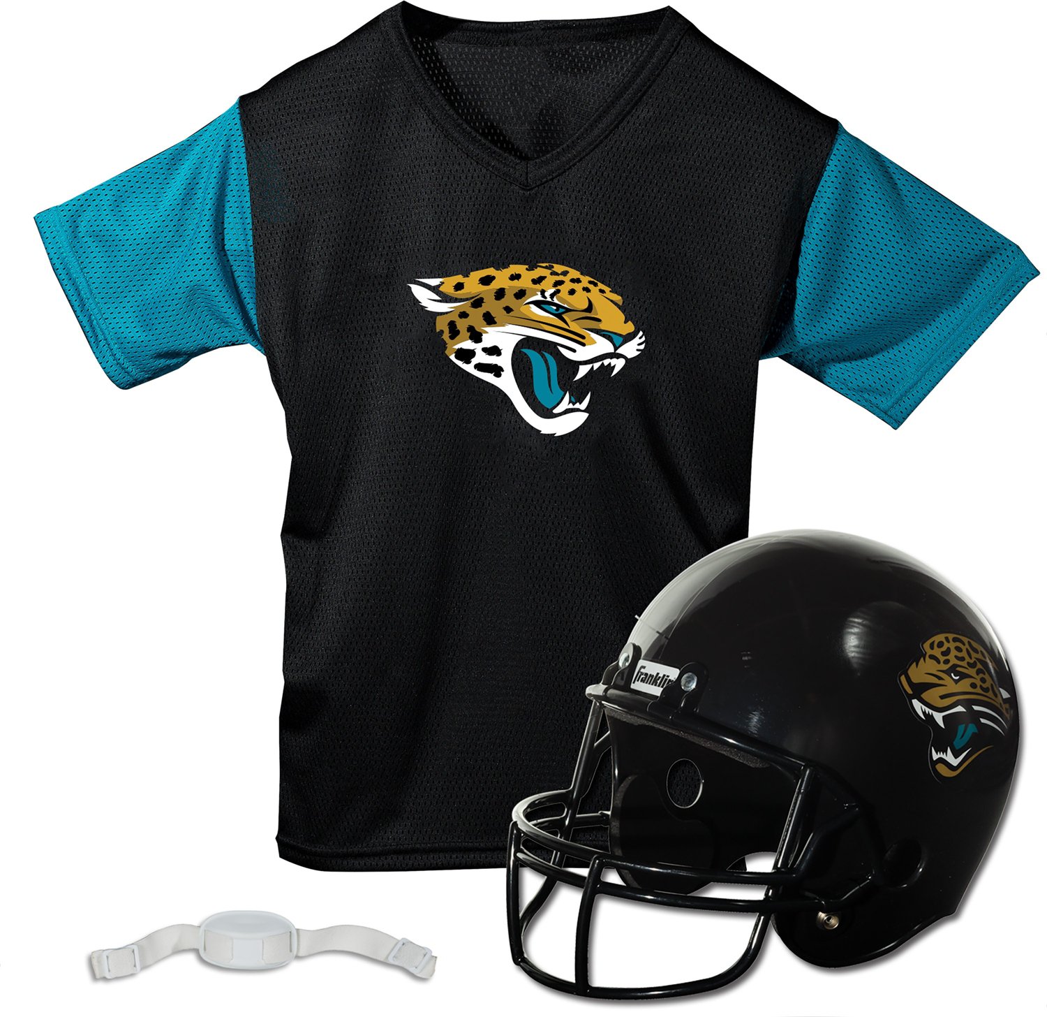 Let your youngster show his or her Jaguars spirit with the Franklin Youth Jacksonville Jaguars Helmet and Jersey Set. The short-sleeve jersey is made of 100% polyester mesh to keep you cool and comfortable, and the team details highlight their fandom. A team helmet with a chin strap completes the ensemble.