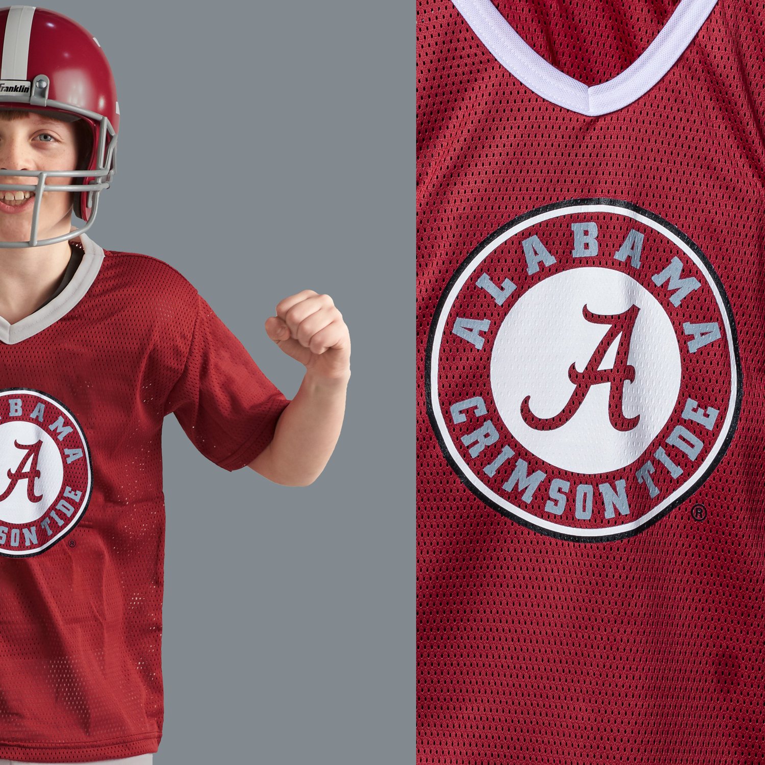 Your child can cheer on the Crimson Tide in the Franklin Youth University of Alabama Football Helmet and Jersey Uniform Set. This jersey is made of 100% polyester mesh for airflow and durability, while the helmet and chin strap provide an authentic look. The Alabama team details show your child's team spirit.