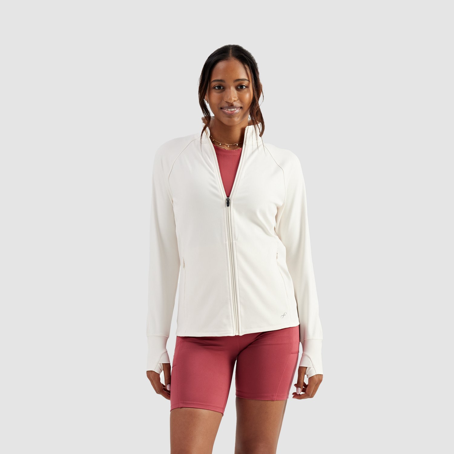 Enhance your wardrobe with the Freely Women's Bonnie Jacket. It is made of 85% recycled polyester and 15% spandex, making it easy to clean. The mock neck adds a drop of elegance, and the front pockets have a zipper closure that secures your items. Its front and back rib panels stretch without losing the original shape.