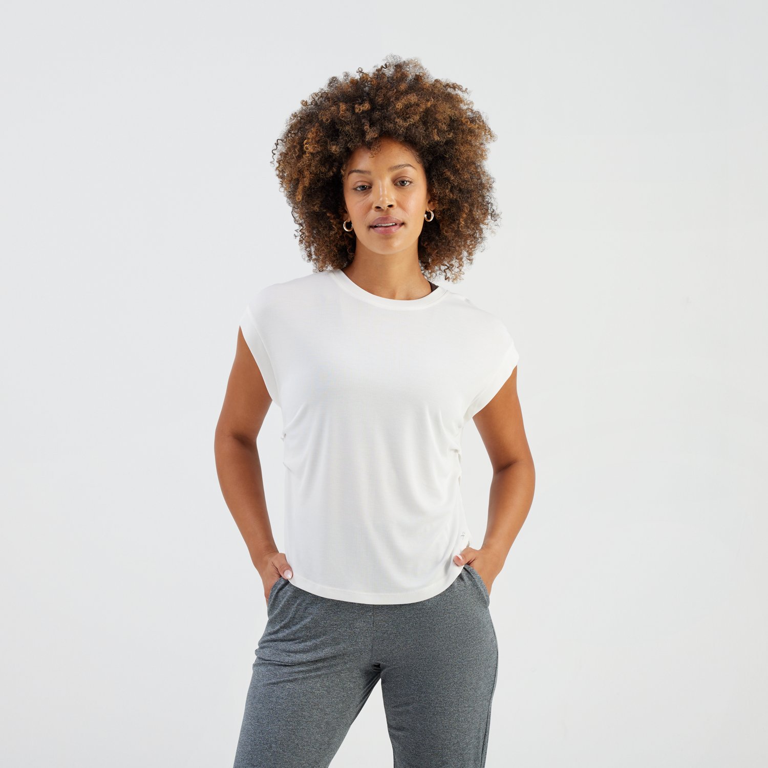Freely Women's Comfortable Destination T-Shirt Crafted from a soft 73% rayon and 27% recycled polyester blend, this women's short sleeve crew neck t-shirt offers a comfortable feel for adults. It's perfect for both your daily lifestyle and casual adventures. Featuring rolled cuffs for added detail, this solid tee provides an effortless look.