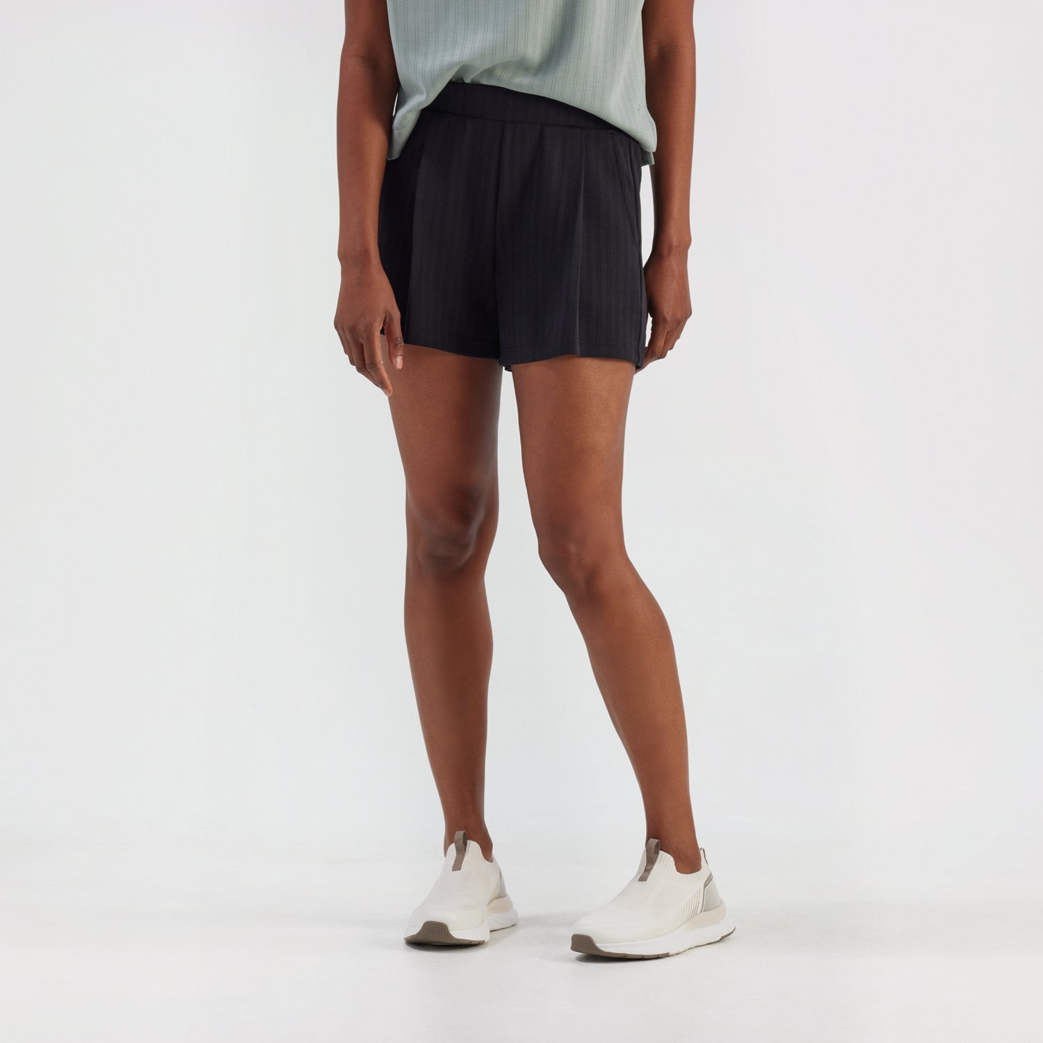 Look your best when you wear the Freely Women's Gemma Shorts 5 in. They are made of 44% rayon, 35% recycled polyester, 15% polyester, and 6% spandex. The encased elastic front and back shirring waistband create a comfortable fit, and their front pleat detailing adds a unique touch. The high rise offers additional coverage.