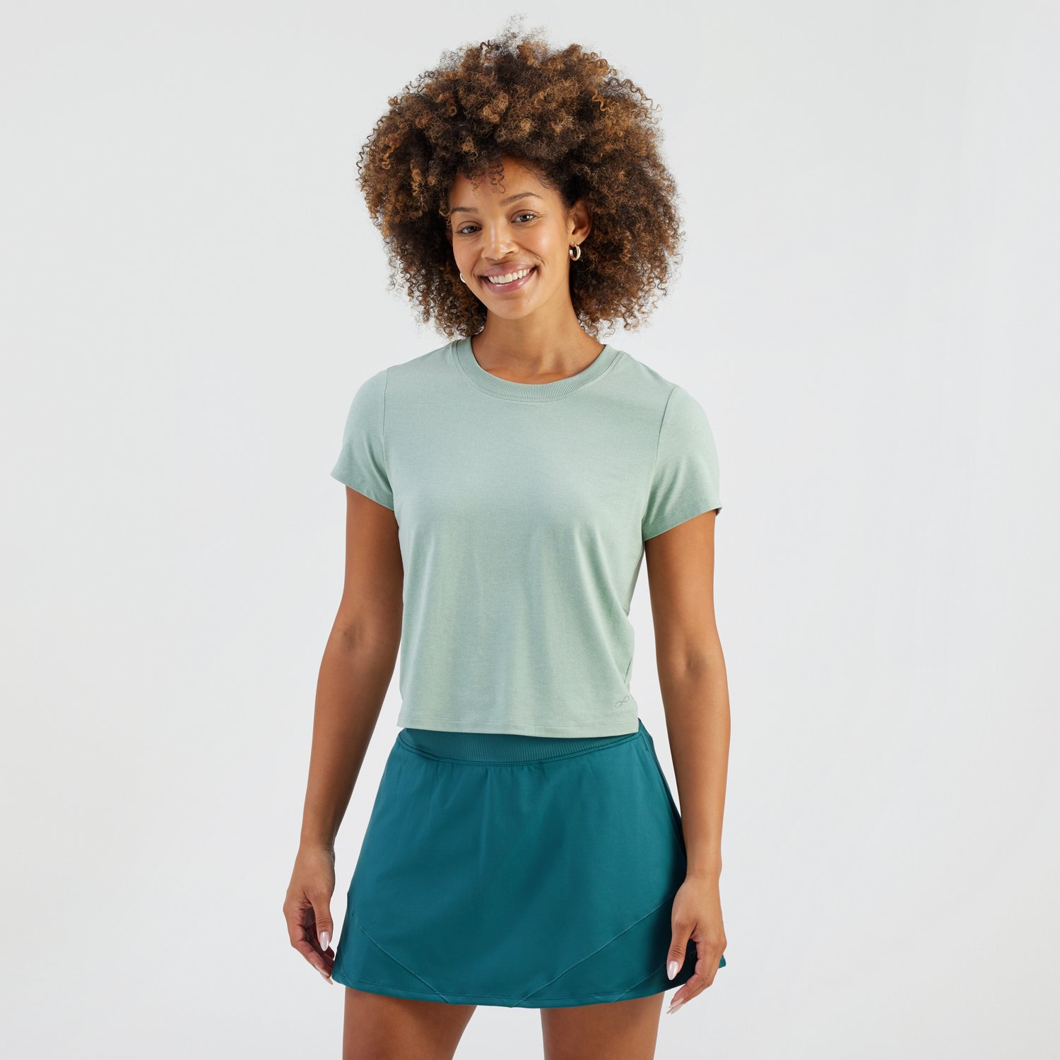Enjoy stylish looks with active comfort with the Freely Women's Kari Short Sleeve T-shirt. The polyester-spandex blend material is stretchy and durable while you move, and the twist-band with cutout detail is stylish and fashionable.
