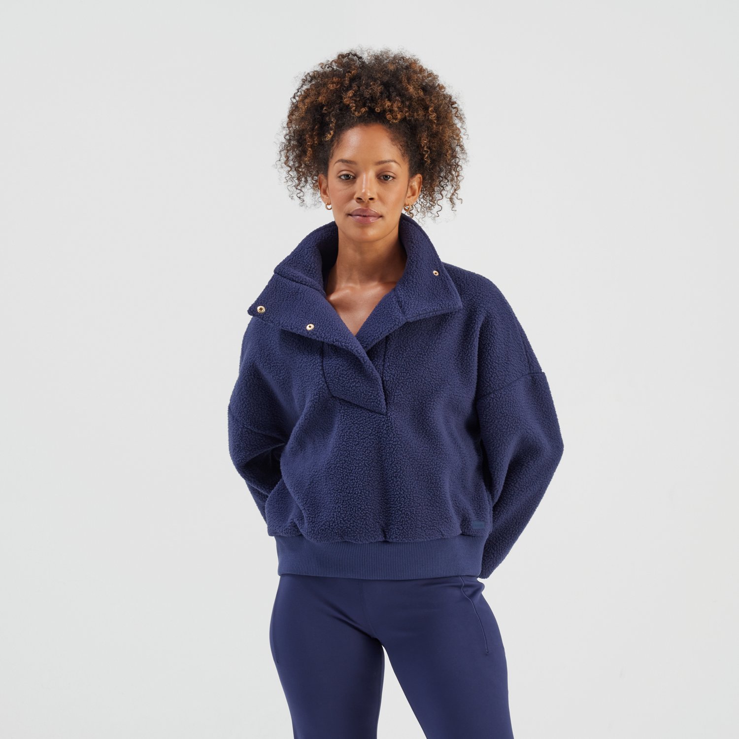 Step out in style wearing this Freely Women's Tracy Pullover, made of a pleasant-feeling sherpa polyester-blend fabric. Its mock neck with gold snap closure and dropped shoulder add touches of style while providing just the right fit.