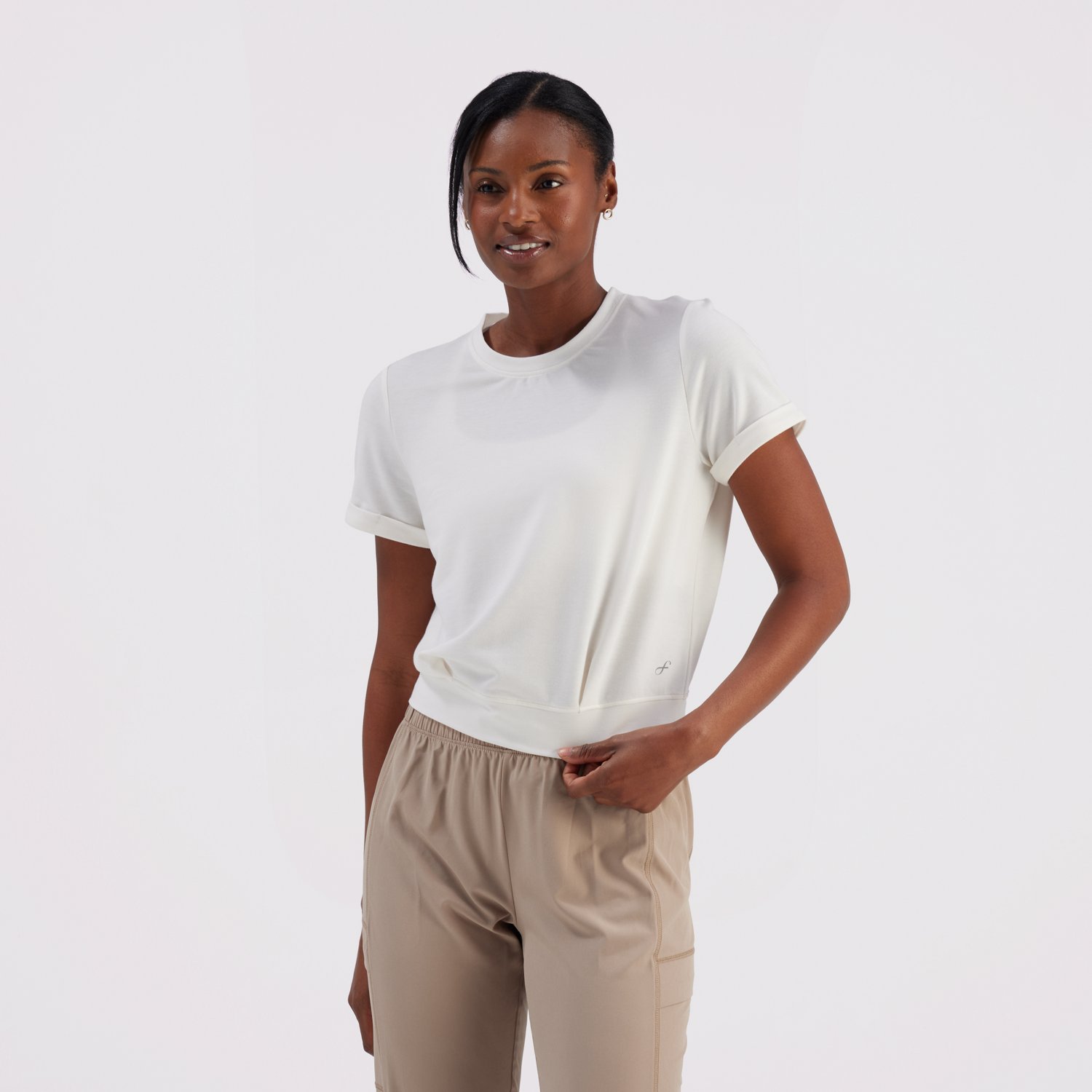 Add the Freely Women's Tyla T-shirt to your closet to have a stylish and softness option for everyday wear. This T-shirt is made of 74% recycled polyester, 22% cotton and 4% spandex to provide a cozy blend, and its rolled and tacked sleeves and hem band with pleat detail create a look you'll love.