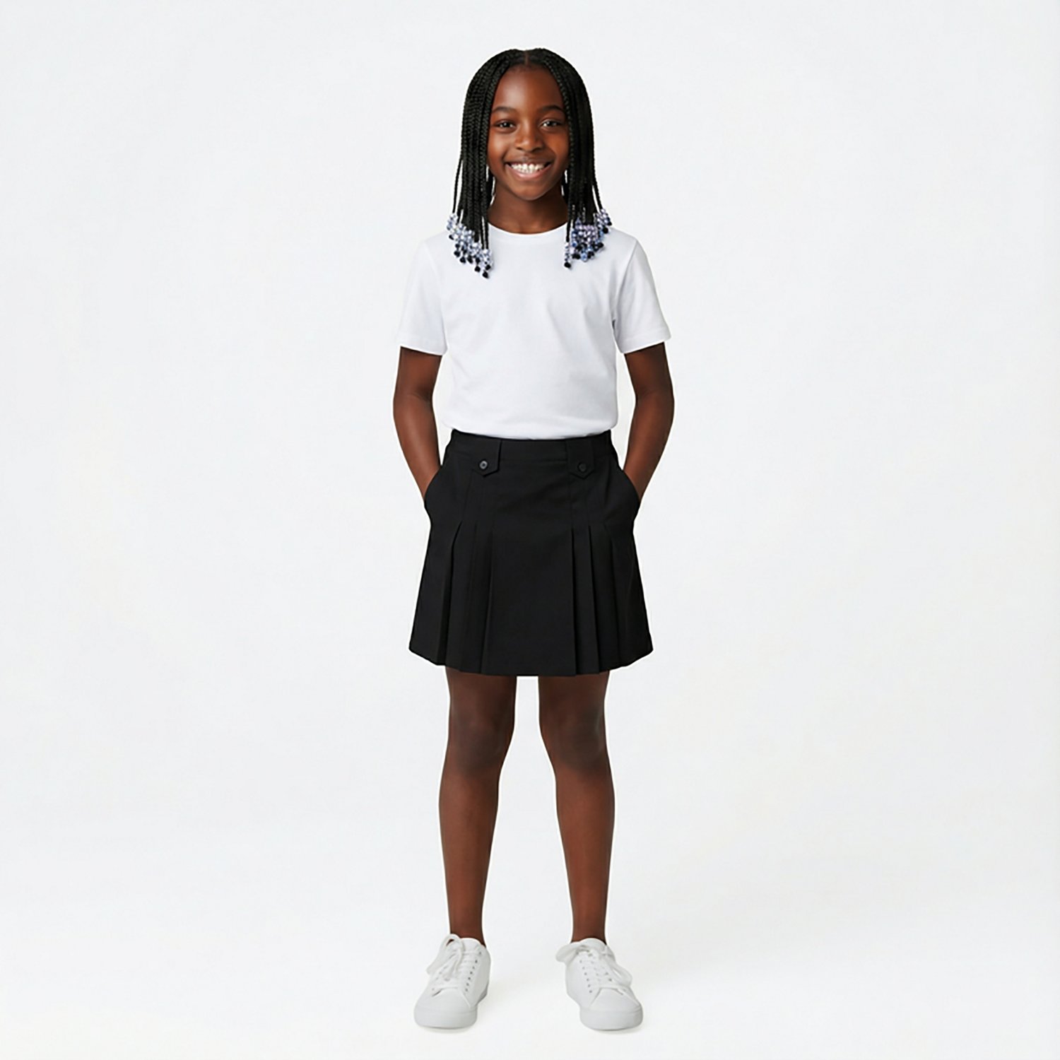The classic look of the French Toast Girls' Front Pleated Skirt with Tabs makes it great for school wear. Made of 100% polyester, this skirt has decorative pleats and button tabs, as well as a side zipper for easy closure.