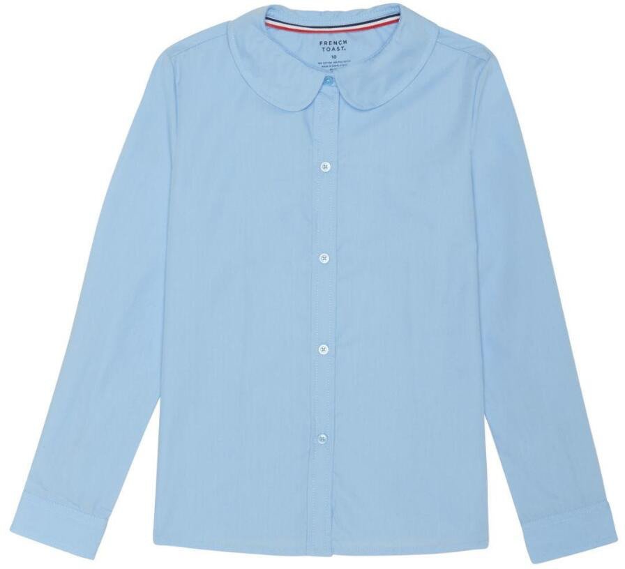 Look to the past for fashion inspiration with the French Toast Girls' Long Sleeve Modern Peter Pan Blouse. A variation on more traditional uniform wear, this top is a great way to liven up your wardrobe and add a unique twist to your personal style. Featuring a rounded Peter Pan collar, this shirt is made with Wrinkle No Moreâ„¢ cotton blend poplin fabric for easy, low-maintenance wear and has been 50-wash tested to ensure long-lasting use.