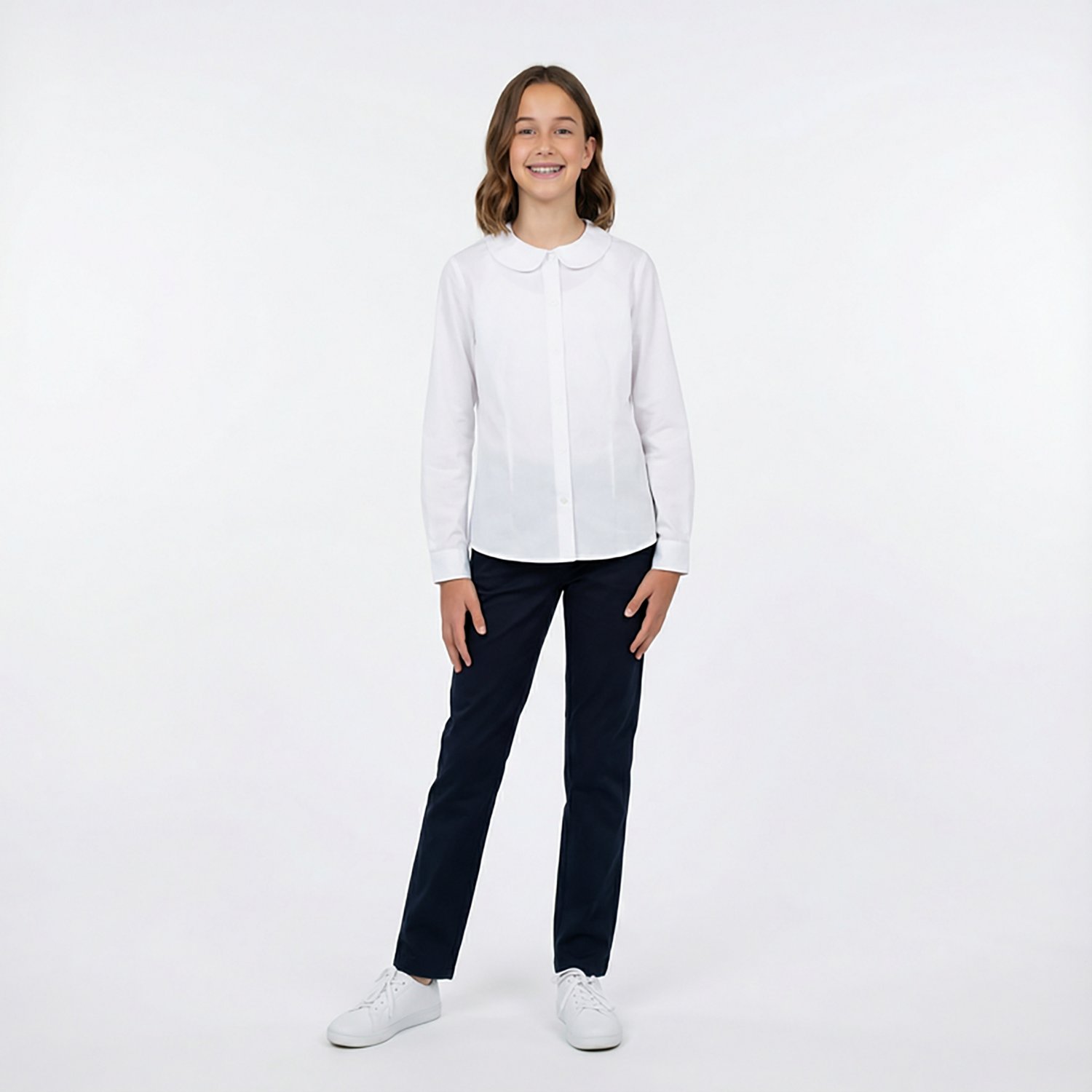 Look to the past for fashion inspiration with the French Toast Girls' Long Sleeve Modern Peter Pan Blouse. A variation on more traditional uniform wear, this top is a great way to liven up your wardrobe and add a unique twist to your personal style. Featuring a rounded Peter Pan collar, this shirt is made with Wrinkle No Moreâ„¢ cotton blend poplin fabric for easy, low-maintenance wear and has been 50-wash tested to ensure long-lasting use.