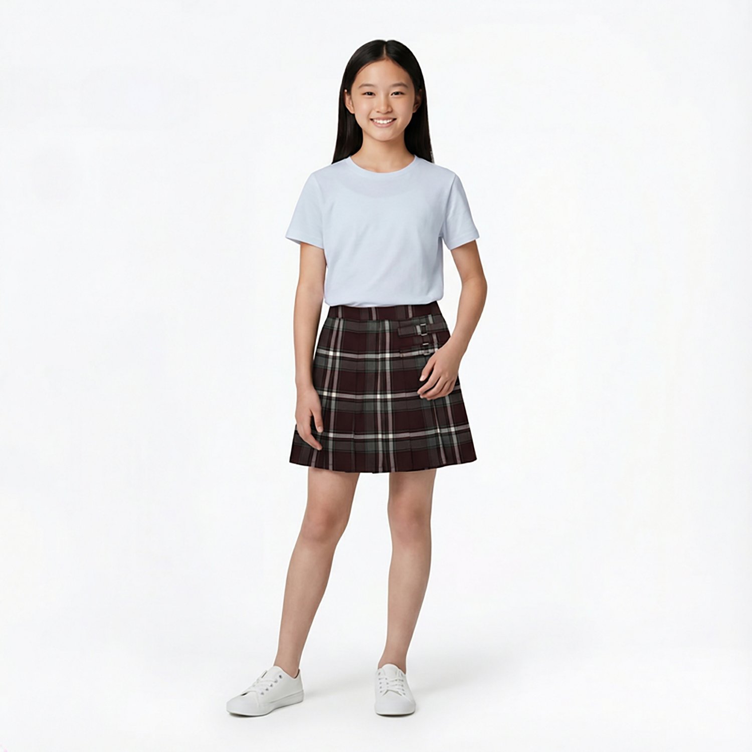 Great for the school day, the French Toast Girls' Plaid 2-Tab Scooter Skirt is made of 100% polyester with built-in knit shorts and a size zipper. The adjustable waist helps ensure a comfortable fit, and the twin-buckle design at the front adds a bit of flair to your outfit.