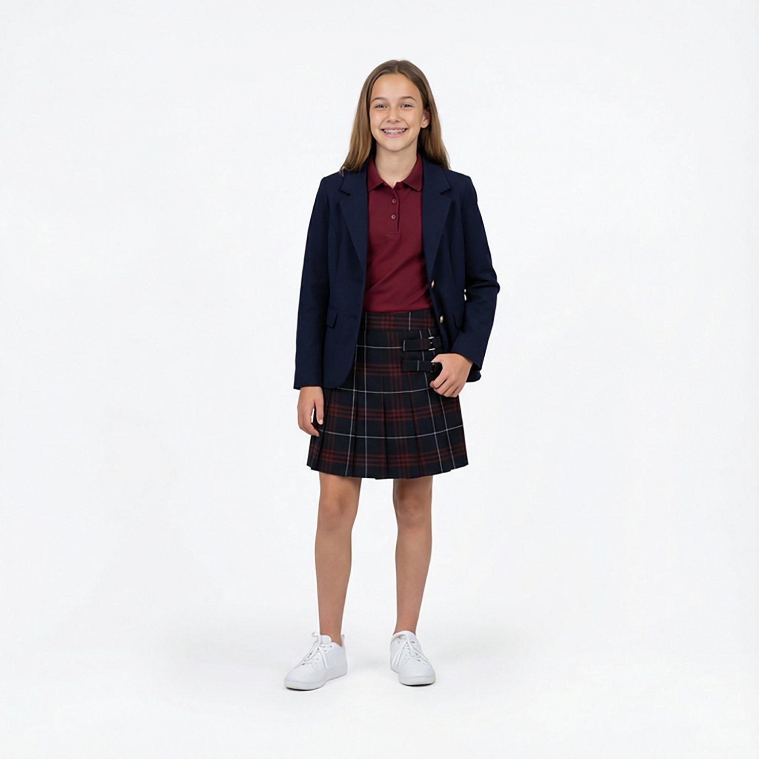 Great for the school day, the French Toast Girls' Plaid 2-Tab Scooter Skirt is made of 100% polyester with built-in knit shorts and a size zipper. The adjustable waist helps ensure a comfortable fit, and the twin-buckle design at the front adds a bit of flair to your outfit.