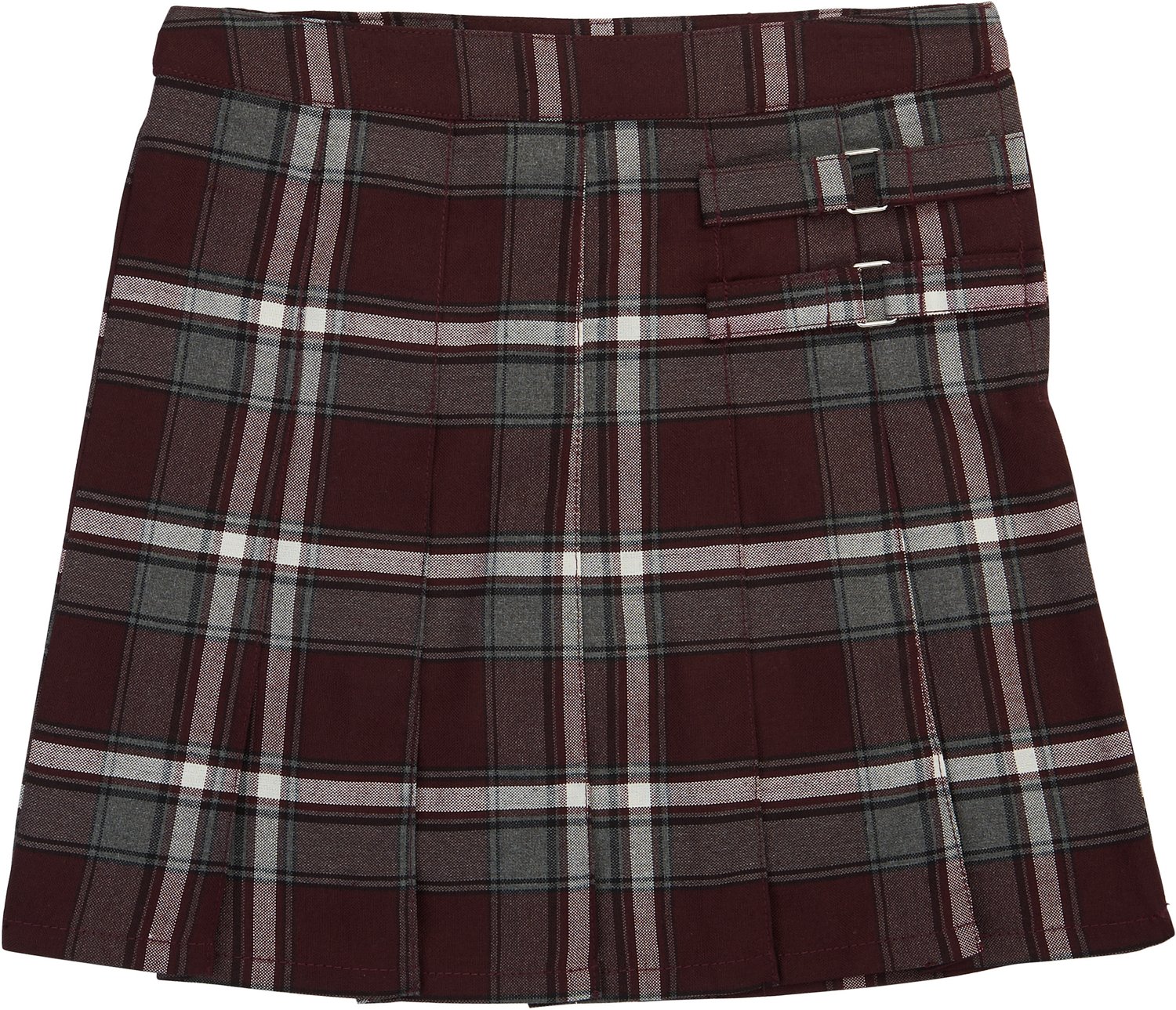 Great for the school day, the French Toast Girls' Plaid 2-Tab Scooter Skirt is made of 100% polyester with built-in knit shorts and a size zipper. The adjustable waist helps ensure a comfortable fit, and the twin-buckle design at the front adds a bit of flair to your outfit.