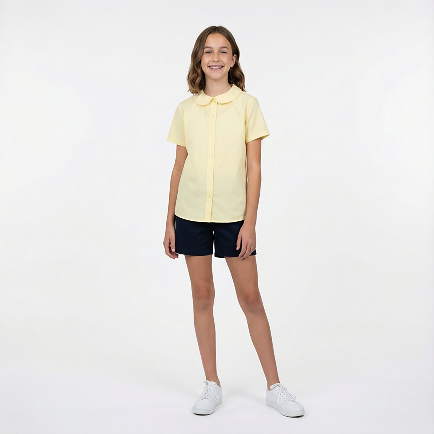 All the features in the French Toast Girls' Plus Size Modern Peter Pan Blouse combine to create a sweet, feminine shirt she'll be excited to wear all day long. It has a button-down design with back darts to keep the fit slim. The Peter Pan collar adds a classic touch to the overall structure, and the Wrinkle No Moreâ„¢ fabric will keep her looking polished.