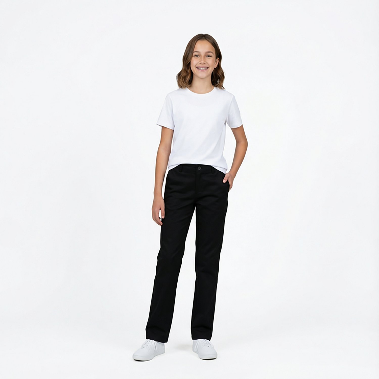 The adjustable waist and straight-leg design of the French Toast Girls' Straight Leg Twill Pant make it a stylish addition to virtually any wardrobe. A hook-and-bar closure provides a snug fit, while the cotton twill blend material has a brushed finish to add an attractive accent to your outfit. 4 pockets.