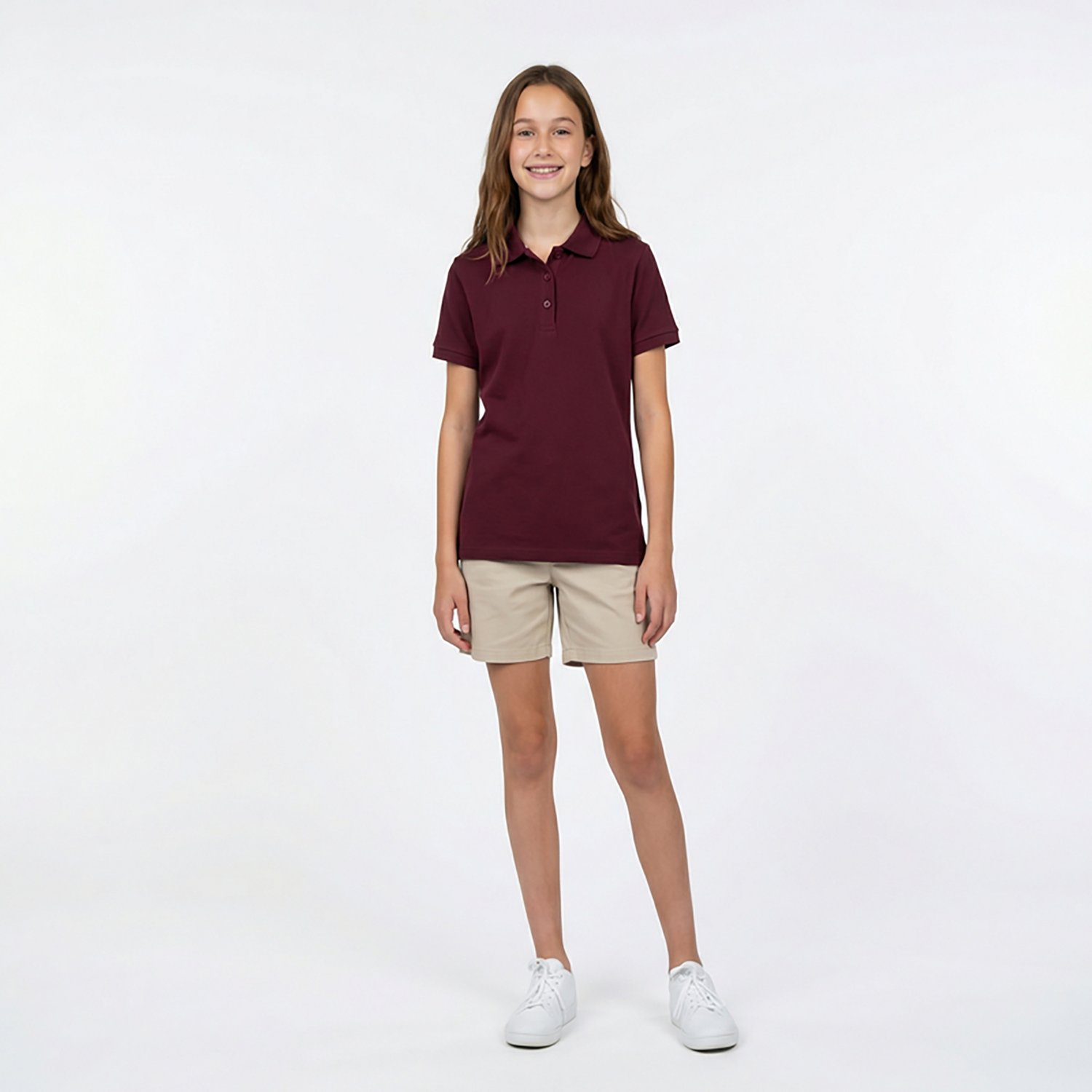 The classic polo gets a girlish update in the French Toast Girls' Polo Shirt with Picot Collar. This shirt has short sleeves and a slim fit for an all around comfortable design. The picot collar and flower buttons add a stylish touch.