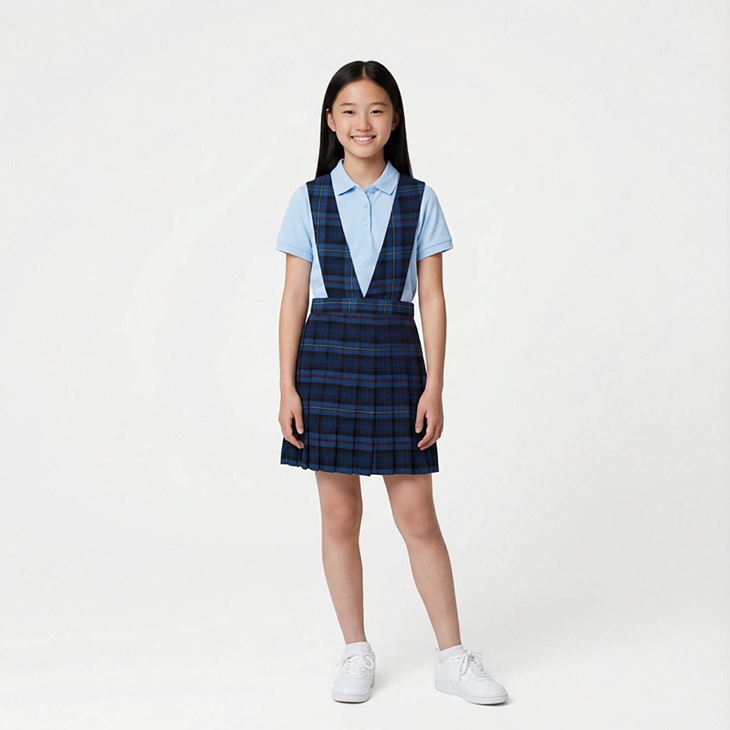 Slip the French Toast Girls' V-neck Pleated Plaid Jumper on over a long-sleeve blouse and tights and you have the classic, everyday school uniform. This jumper is made with 100% polyester fabric and pleating all around the skirt for some extra flair. The elastic waistband, zipper and button closure secure the jumper.