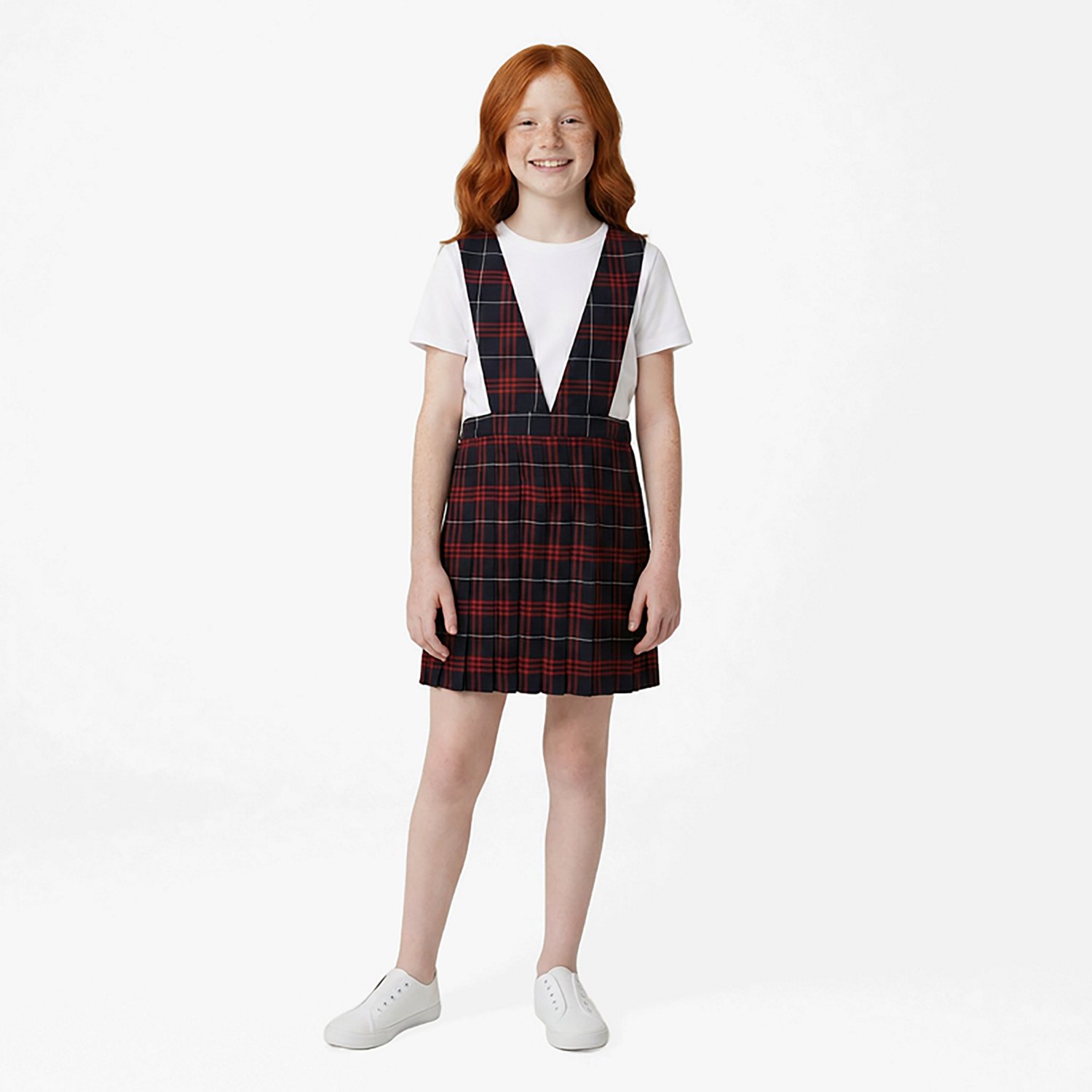 Slip the French Toast Girls' V-neck Pleated Plaid Jumper on over a long-sleeve blouse and tights and you have the classic, everyday school uniform. This jumper is made with 100% polyester fabric and pleating all around the skirt for some extra flair. The elastic waistband, zipper and button closure secure the jumper.