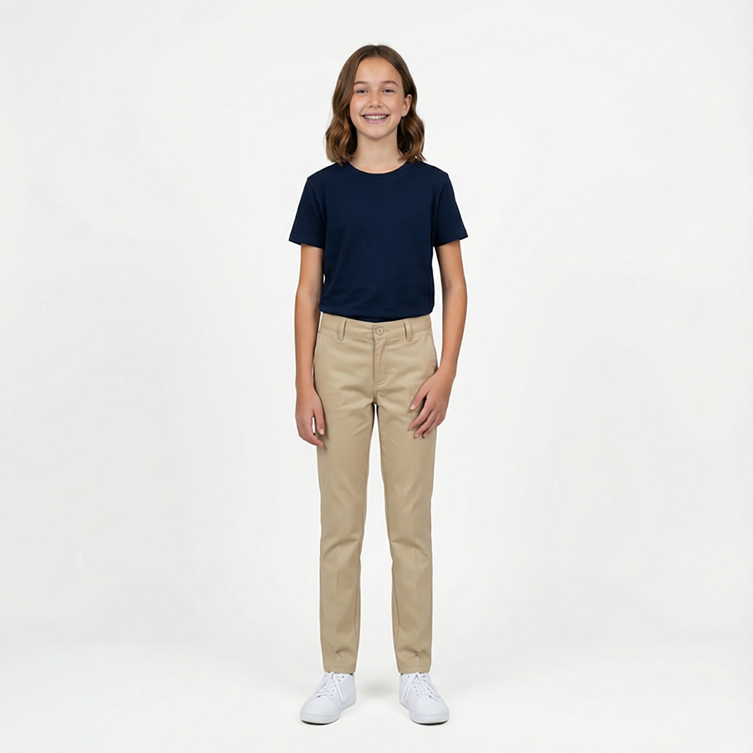 Find the right fit for you with the French Toast @School Girls' Adjustable Waist Stretch Twill Skinny Pants. The 98% cotton and 2% elastane construction provides enough stretch to conform to your body, while the adjustable waist allows you to customize the fit. The side seam and back welt pockets offer space to stash your valuables, and the chalk button with hook-and-eye closure delivers secure wear.