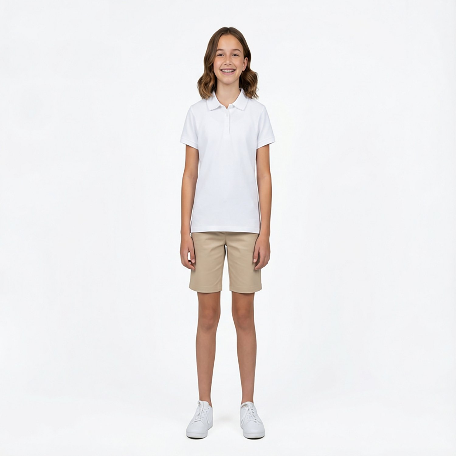 Head to school with style by wearing the French Toast @School Girls' Picot Collar Interlock School Polo Shirt. The 60% cotton and 40% polyester interlock construction provides a comfortable feel, while the 3-button placket allows you to adjust your coverage. The pearlized flower buttons and picot trim on the flat knit collar offer a touch of style.