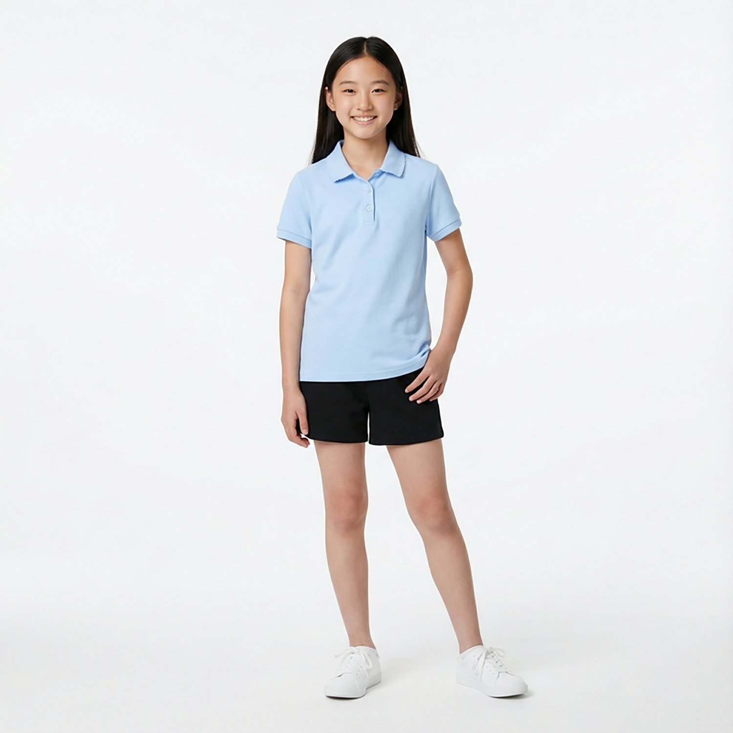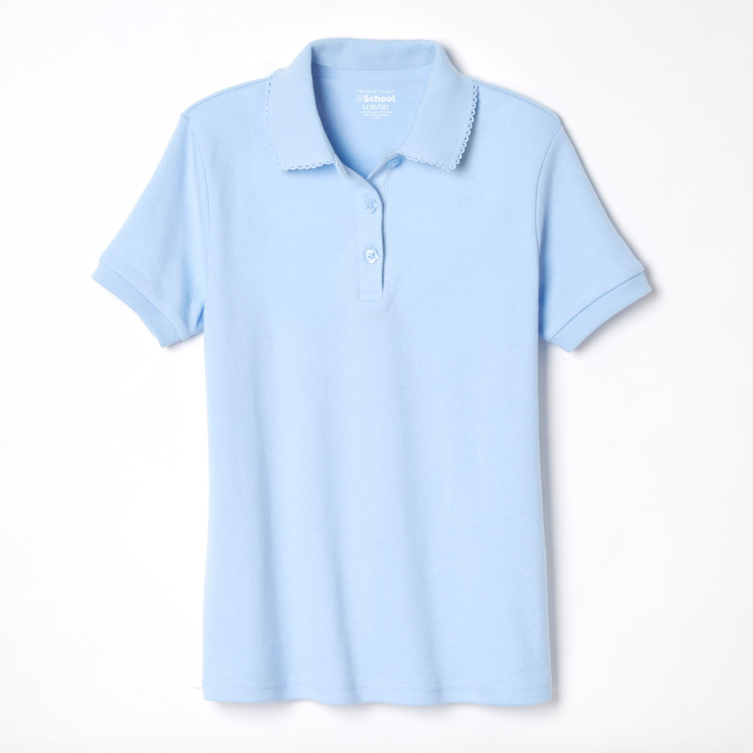 Head to school with style by wearing the French Toast @School Girls' Picot Collar Interlock School Polo Shirt. The 60% cotton and 40% polyester interlock construction provides a comfortable feel, while the 3-button placket allows you to adjust your coverage. The pearlized flower buttons and picot trim on the flat knit collar offer a touch of style.