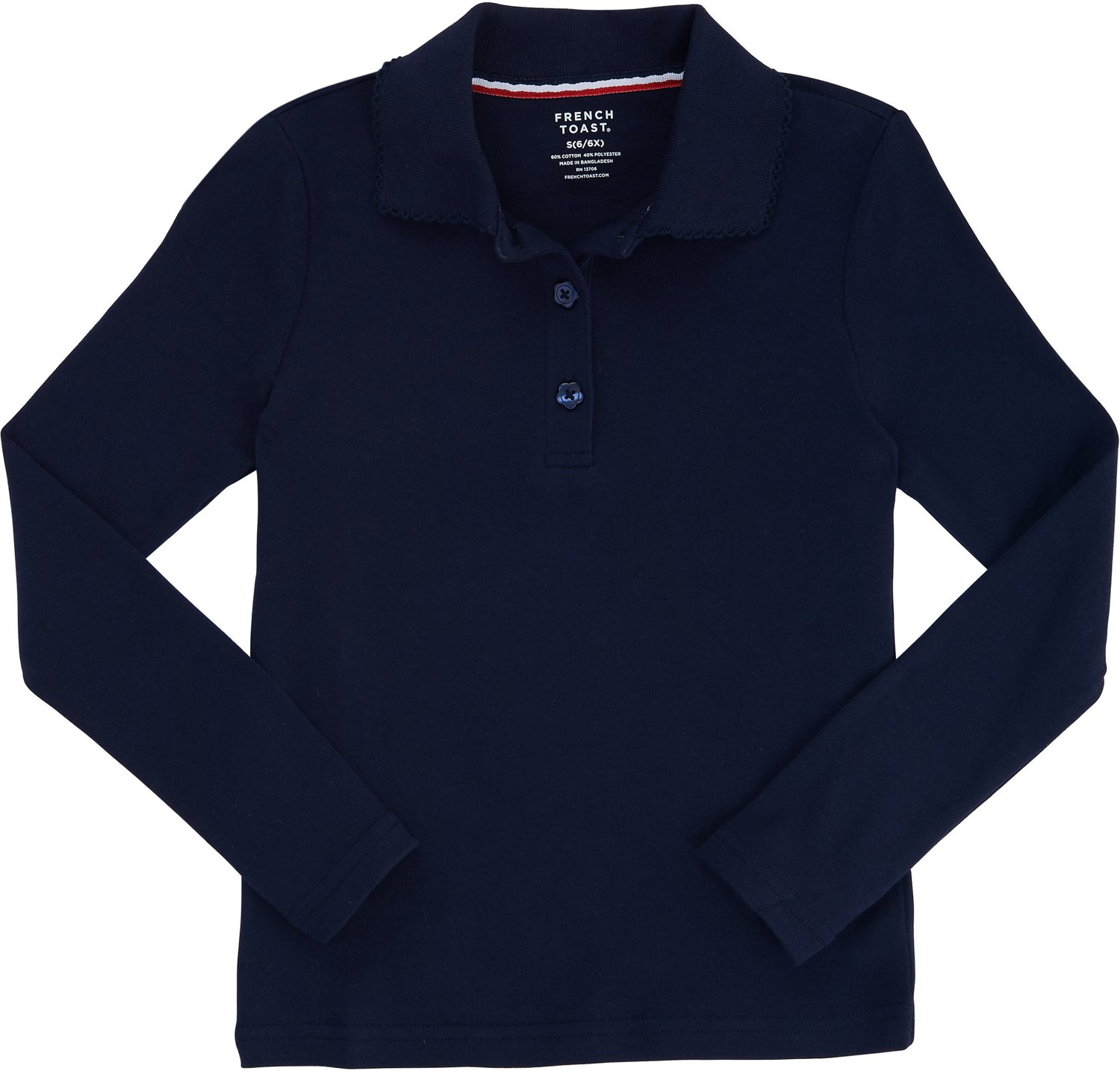Stay warm on chilly days with the French Toast Toddler Girls' Long Sleeve Picot Collar Knit Polo Shirt. The long sleeves and body are crafted from cotton-polyester interlock knit material for a soft feel, while the slim fit ensures a flattering silhouette.
