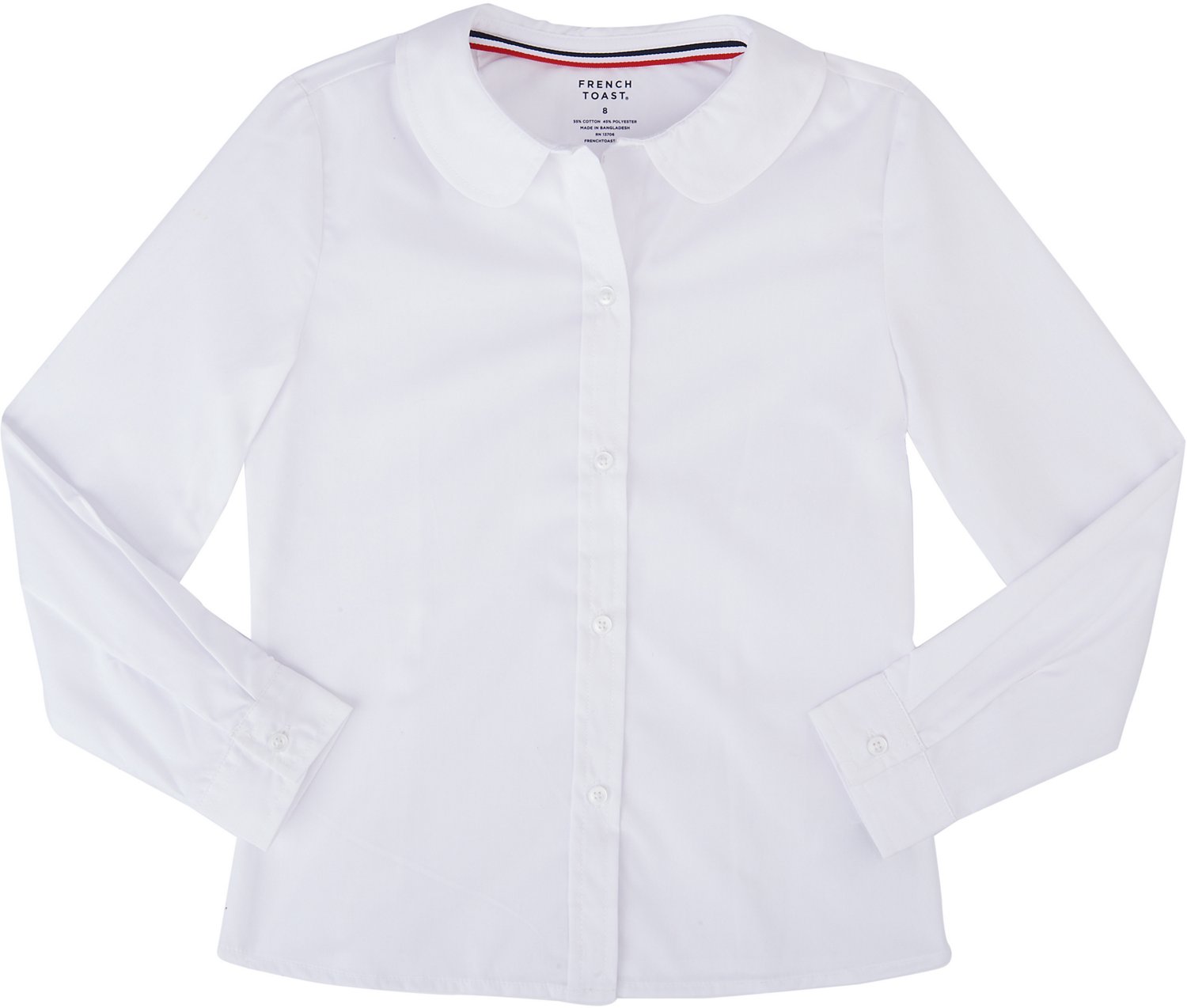 Pull on the French Toast Toddler Girls' Modern Peter Pan Long Sleeve Blouse to enjoy classic style thanks to the modern Peter Pan collar, back darts and sleeve cuff pleats. The Wrinkle No Moreâ„¢ fabric simplifies care.