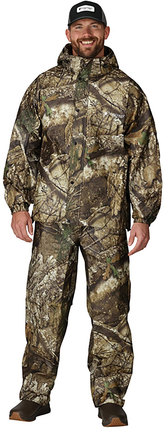 Stay dry while hunting, fishing or adventuring with the frogg toggs Men's Classic All-Sport Rain Suit. This 2-piece suit is lightweight and waterproof to help you stay warm and dry. The rain jacket features a removable hood with a drawstring for easy adjusting, a snap-down storm flap for extra protection and raglan sleeves for full range of motion. The long pants have an adjustable elastic waist that stays in place and large leg openings to easily pull over shoes or boots.