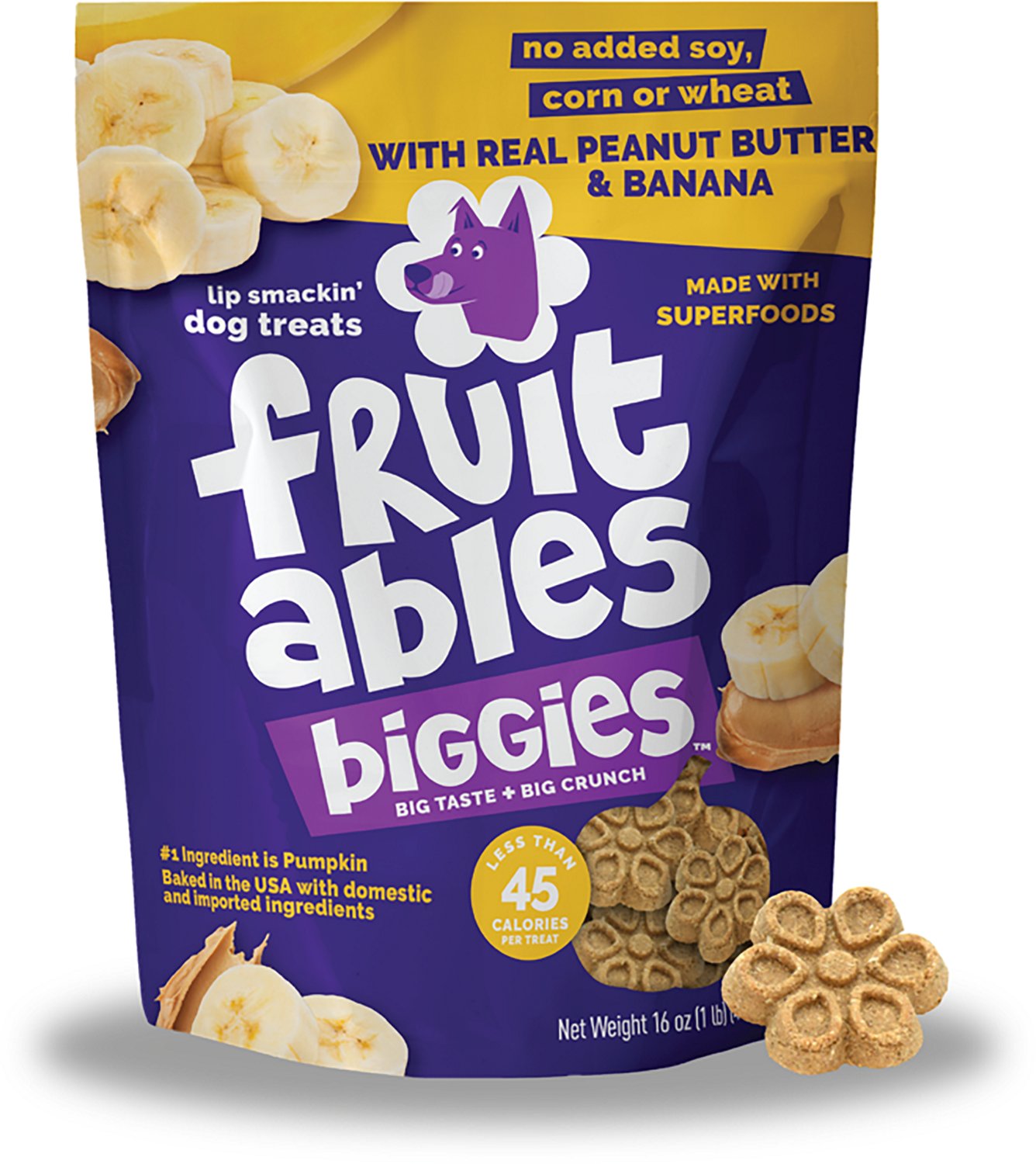Reward your furry friend with the Fruitables Biggies 16 oz. Dog Treats. Their baked texture creates a satisfying crunch. The peanut butter is high in fiber and protein, and their potassium content in bananas promotes digestive health. The potatoes help improve digestive health.