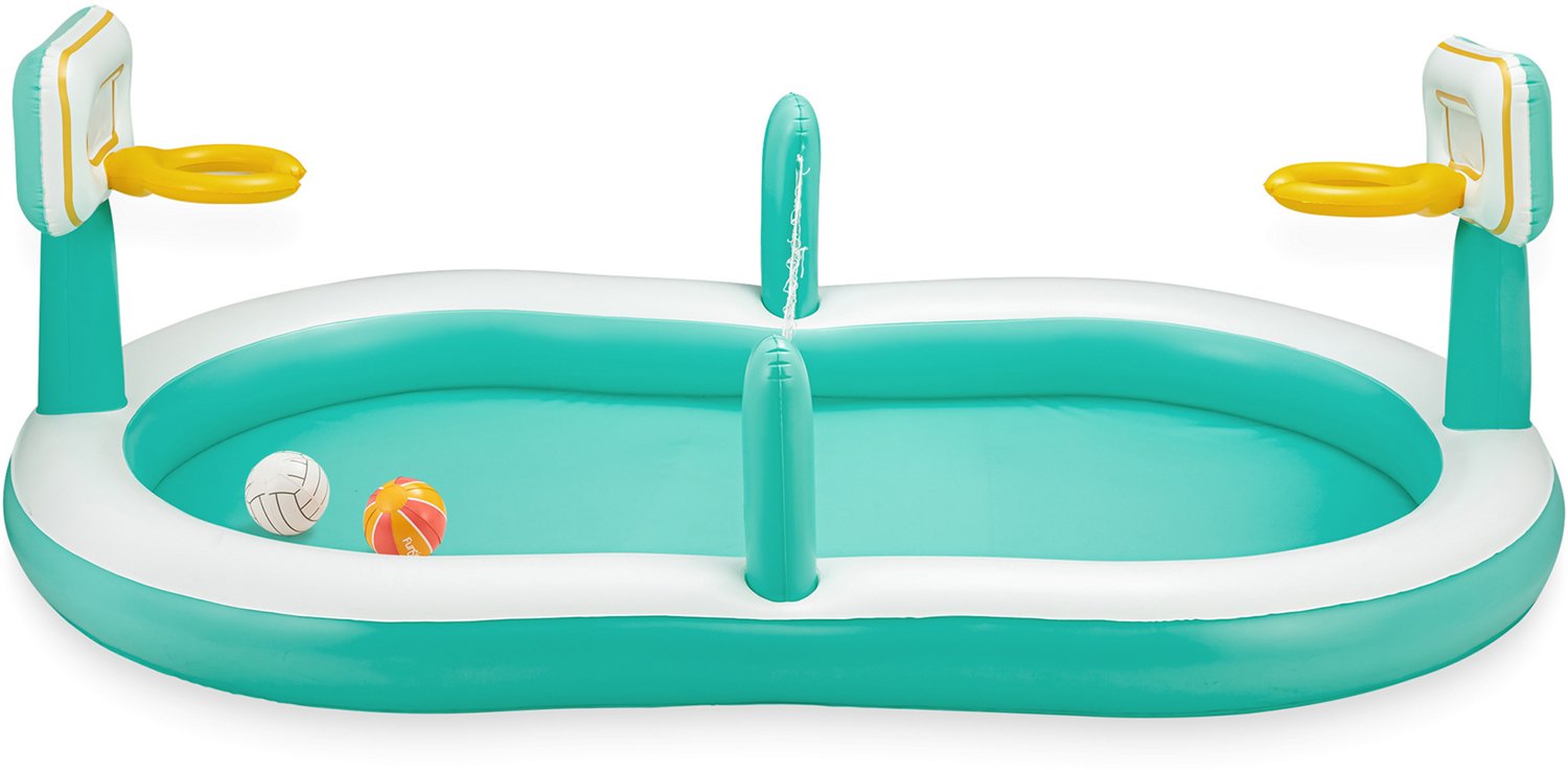 Splash around in the Funsicle Sports Arena 9.8 ft Inflatable Pool. The PVC material is durable, and the 2 basketball hoops and detachable volleyball net allow you to customize which game you play. The 11 air chambers help increase buoyancy.