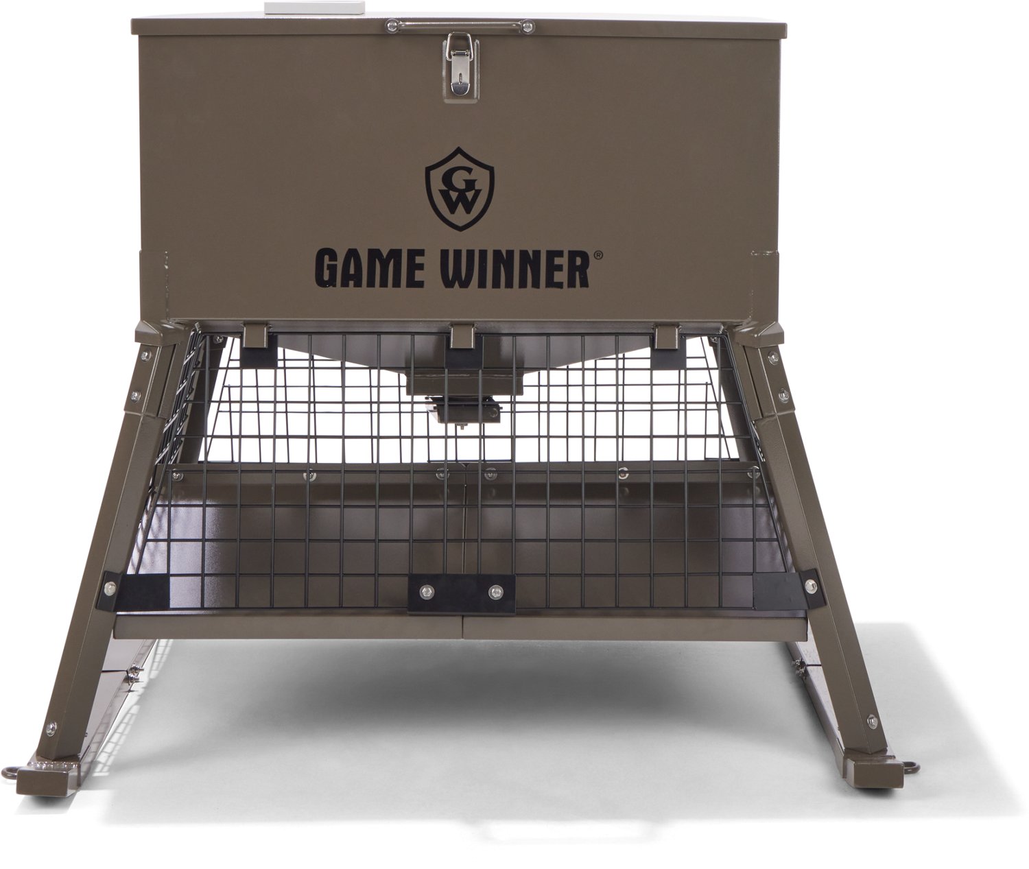 Set up your feeding area with the Game Winner 350 lb Foreman Feeder. The 16 gauge steel construction affords durability, while the oversize deflector plate defends against critters. The heavy gauge steel sled base allows for easy placement, and the hopper sight glass offers a quick view of the feed level.