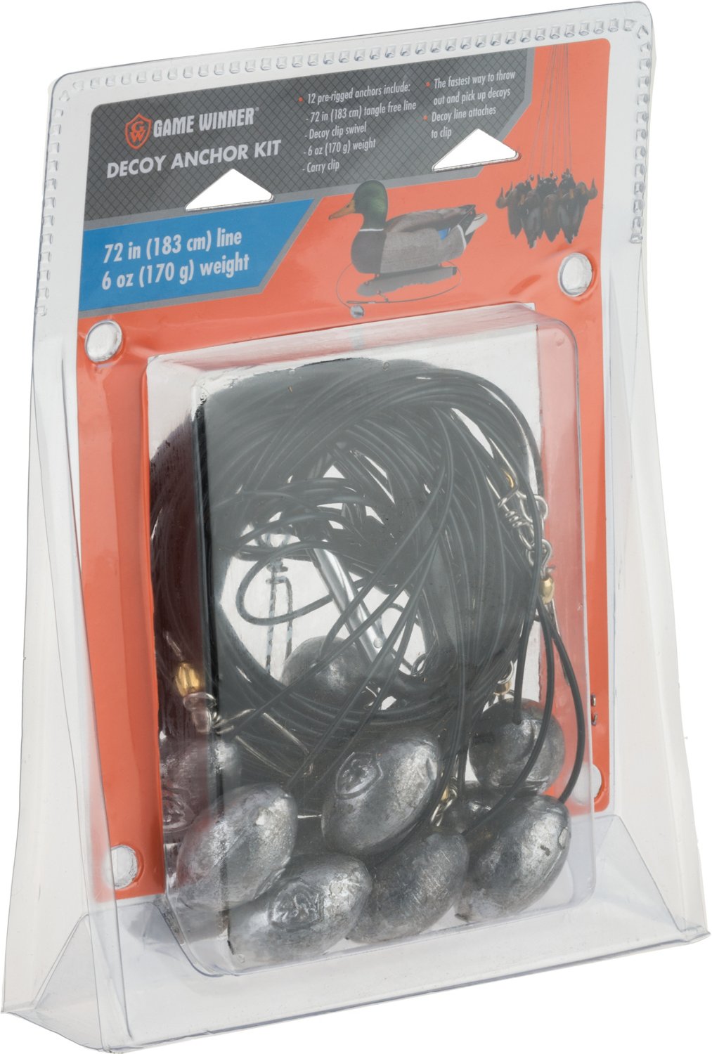 Quickly throw out and pick up your decoys using the Game Winner® 72" Decoy Anchor Kit. The kit includes 12 prerigged anchors with 72" of tangle-free line, 6 oz. weights, a decoy clip and a carry clip.