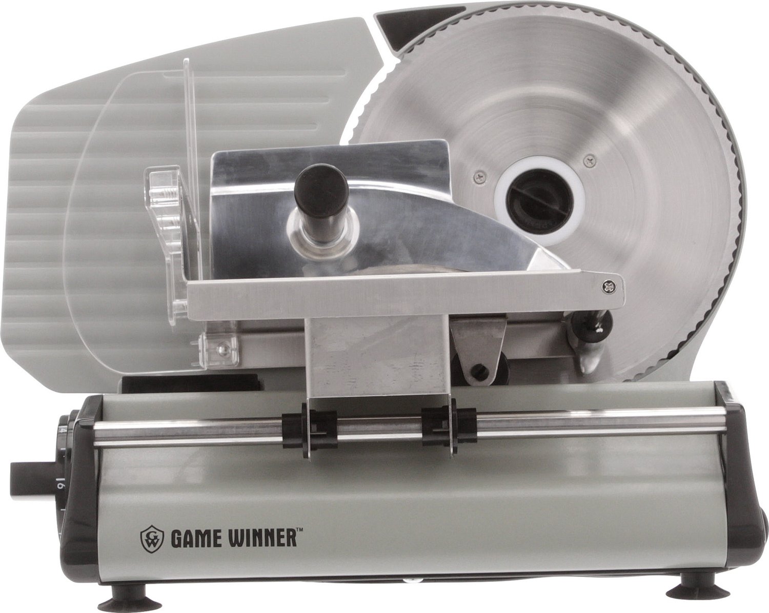 Slice up meat, cheeses and more from deli thin to 9/16" thick with the Game Winner® 8.7" Heavy-Duty Electric Meat Slicer. Featuring an 8.7" hardened-steel adjustable blade with a serrated edge to help provide quick and effective slicing, the cast-aluminum food guide is designed with sharp teeth to help promote controlled slicing. The 180W electric motor with permanently lubricated parts offers smooth operation.