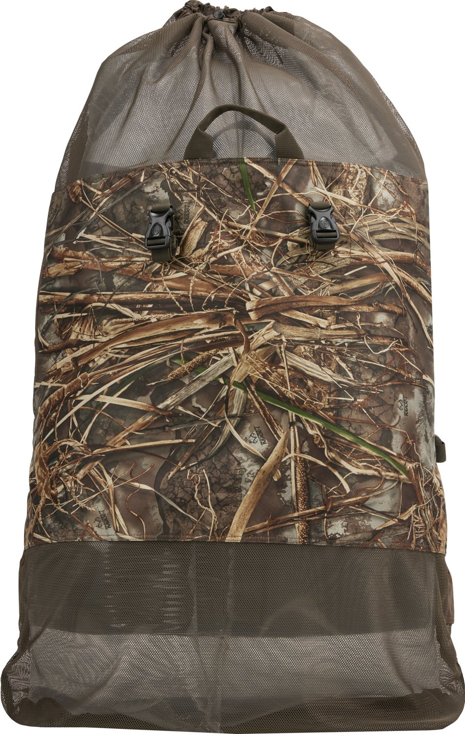 The Game Winner® Camo Floating Duck Decoy Bag holds up to 24 standard-size duck decoys and is made of heavy-duty polyester mesh with a PVC coating and a Realtree Max-5® camo pattern. Adjustable backpack, sternum and waist belt straps.