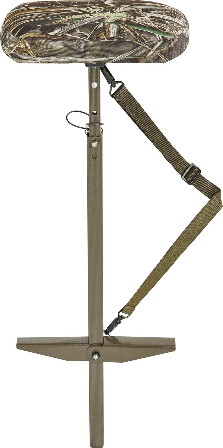 Take a break while hunting, fishing or hiking with the Game Winner Realtree Max-7 Swamp Seat, which features a padded seat covered with heavy-duty PVC polyester fabric in a Realtree Max-7® camo pattern and is supported by a powder-coat aluminum frame for durability and light weight. The hinged design and adjustable shoulder strap (included) offer easy transport. Foldout feet provide stability in soft soil. Adjustable height for convenience.