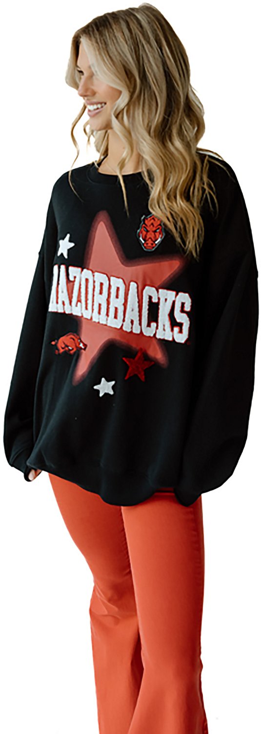 Root for your favorite team when you wear the Gameday Social Women's Arkansas Razorbacks Aura Stars Oversized Fleece Crew Sweatshirt. It is made of 60% cotton and 40% polyester. The long sleeves keep you warm, and its crew neckline creates a casual look. The embroidered Arkansas Razorbacks graphics show off your team spirit.