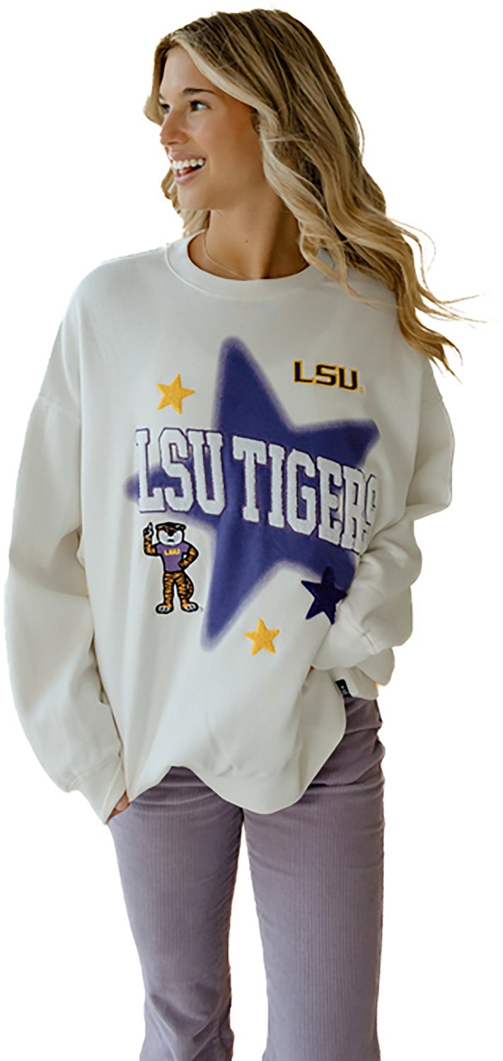 Root for your favorite team when you wear the Gameday Social Women's LSU Tigers Aura Stars Oversized Fleece Crew Sweatshirt. It is made of 60% cotton and 40% polyester. The long sleeves keep you warm, and its crew neckline creates a casual look. The embroidered LSU Tigers graphics show off your team spirit.