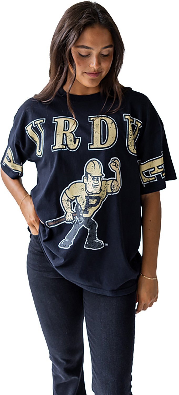 Root for your favorite team when you wear the Gameday Social Women's Purdue Boilermakers Southern Split Oversized Band Short Sleeve T-shirt. It is made of 100% cotton. The short sleeves keep you cool, and its crew neckline creates a casual look. The screen printed Purdue Boilermakers graphics show off your team spirit.