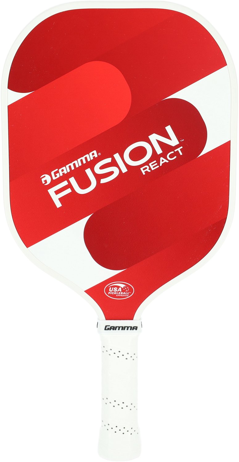 Ace the game with the Gamma Fusion React Pickleball Paddle. The 13 mm polymer honeycomb core enhances power. Its textured fiberglass surface ensures stability, and the Gamma Pro Lite grip is designed for beginners.