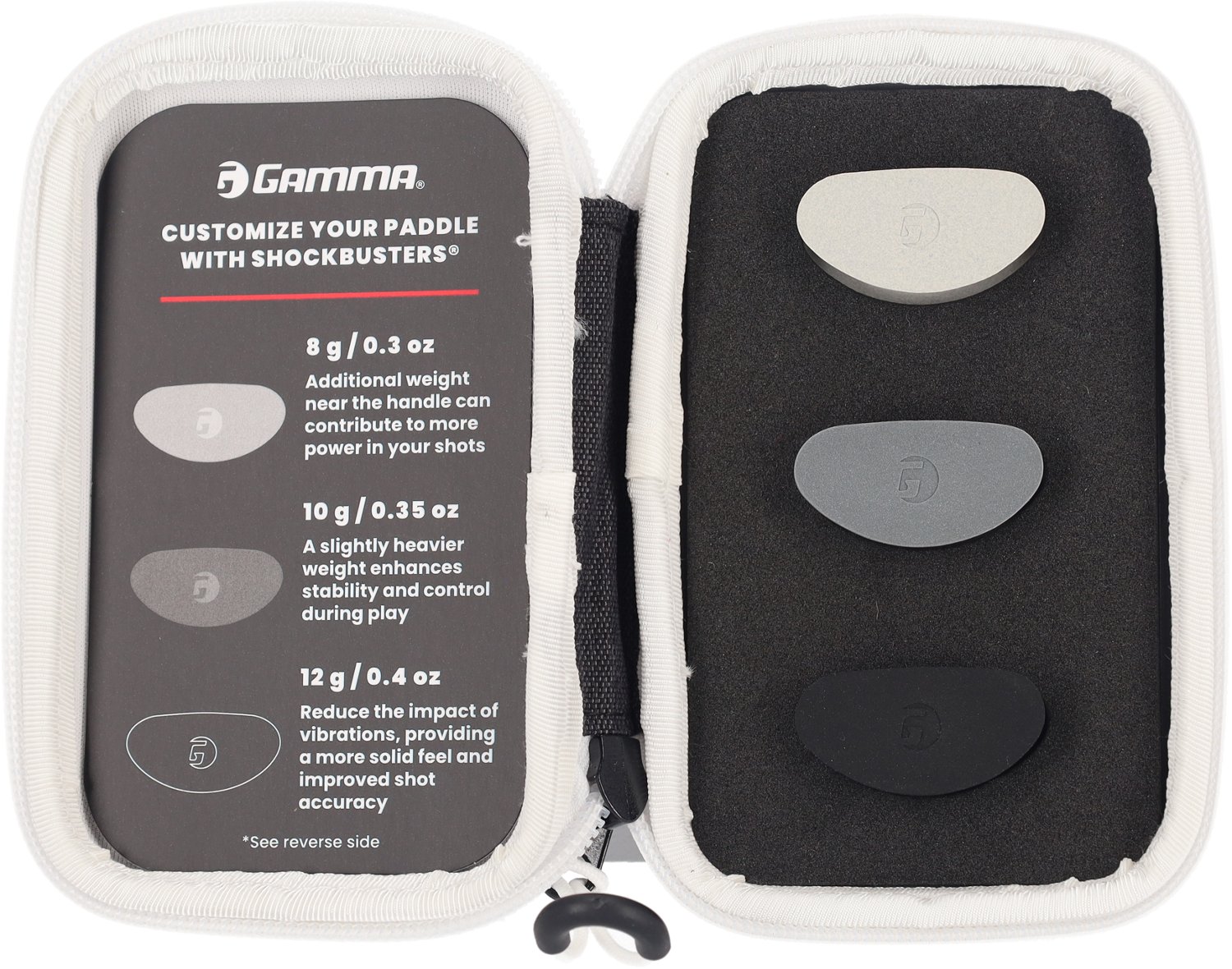 Customize your paddle to reflect your personality and playing style with the Gamma RCF Airbender 13 Weighted Shockbuster Kit. These durable weights are made of rubber with Zorbicon gel for lasting use, vibration reduction and stability. They are easy to install and come with 3 different weight options, allowing you to fine tune your paddle to fit your playing style.