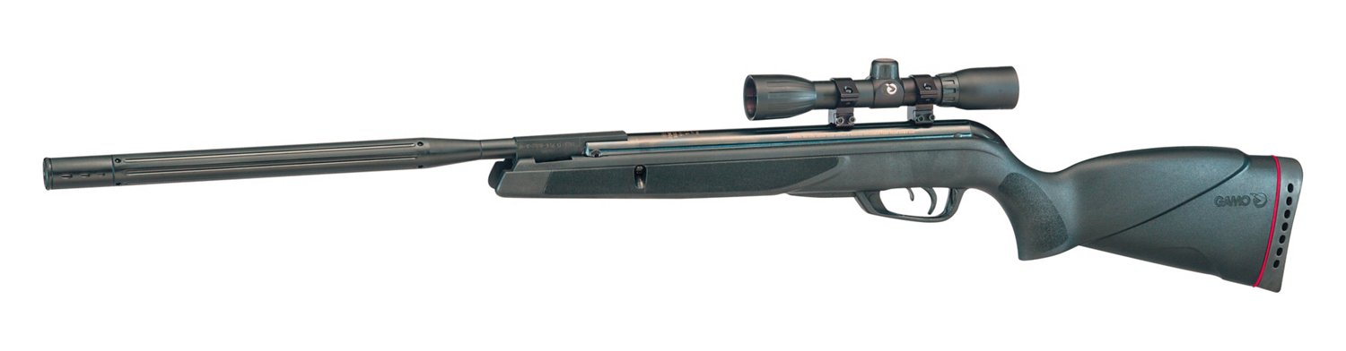 Great for pest control and recreational shooting, the Gamo Wildcat Whisper .177 Caliber Air Gun is equipped with a 4 x 32 mm scope and features a polymer-jacketed steel barrel with Whisper noise-dampening technology. A rubber pad absorbs recoil. All-weather, automotive-grade glass-filled nylon stock.